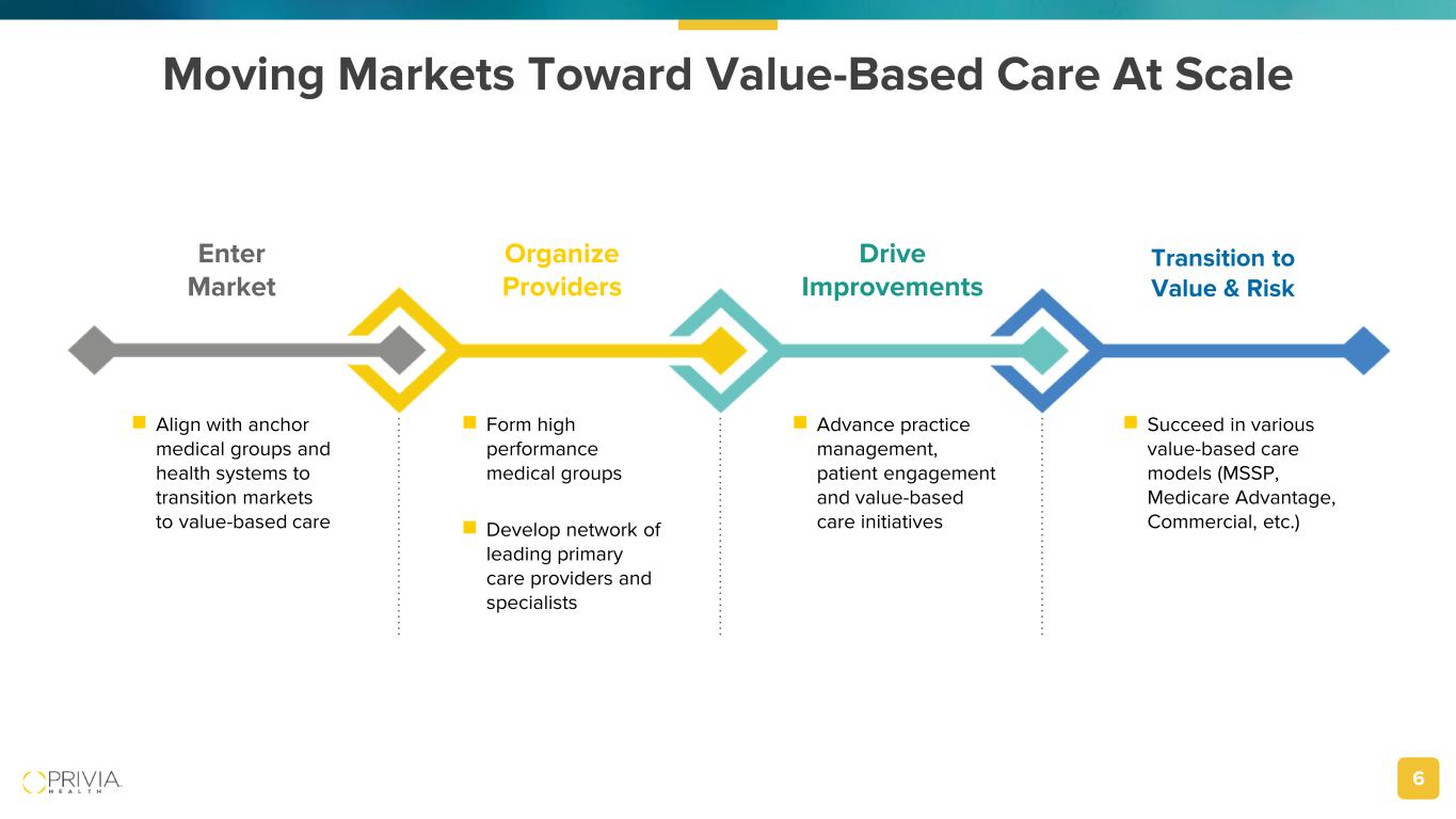 5 Building One of the Largest Primary Care-Centric Ambulatory Care Delivery Networks * 920+ Care Center Locations 3,595 Implemented Providers 10 States (plus D.C.) * All data as of September 30, 2022, except for the launch of the North Carolina and Ohio markets. Joint venture and strategic partnership in North Carolina announced November 3, 2022, and Ohio is contingent on the negotiation and execution of definitive agreements with OhioHealth (see press release: https://ir.priviahealth.com/news- releases/news-release-details/privia-health-partner-ohiohealth-health-system). 4M+ Patients 846K Attributed Lives 84 Patient NPS 57 Provider NPS 95+% Provider Retention Mid-Atlantic Tennessee Georgia Florida North Texas Gulf Coast California West Texas Montana 51 Specialties on Platform Ohio North Carolina