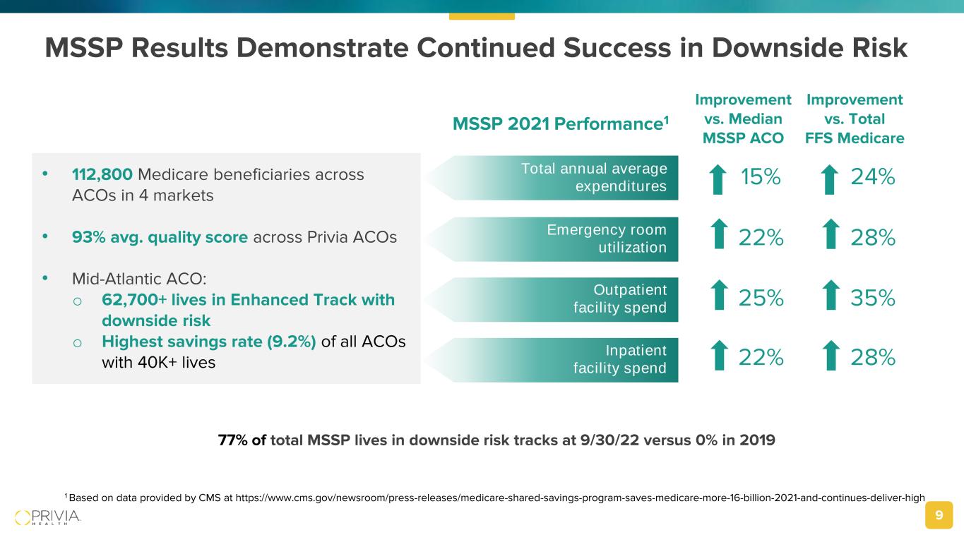 8 Privia Has Extensive Experience in Managing Risk “It’s Called Risk for a Reason” Managing the Transition to Risk Profitably Diversification  80+ contracts, including partial capitation & value- based incentives  Contractual protections in each program Robust Oversight  Audit / Compliance  Healthcare economics / Actuarial expertise Operational Execution  Physician-led governance  Clinical / performance operations capabilities  Technology platform
