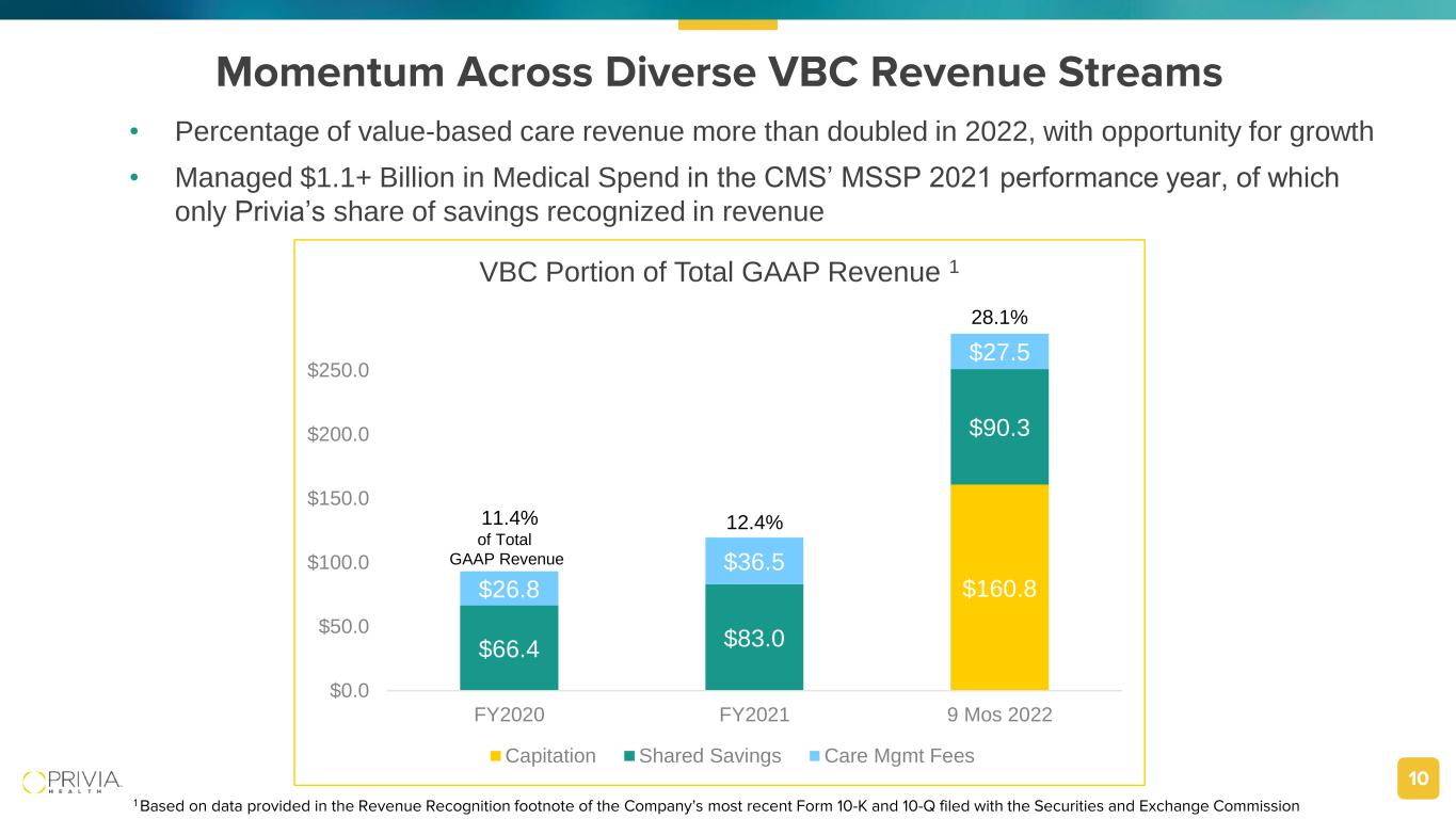 9 MSSP Results Demonstrate Continued Success in Downside Risk MSSP 2021 Performance1 Total annual average expenditures Emergency room utilization Outpatient facility spend Inpatient facility spend Improvement vs. Median MSSP ACO Improvement vs. Total FFS Medicare 15%• 112,800 Medicare beneficiaries across ACOs in 4 markets • 93% avg. quality score across Privia ACOs • Mid-Atlantic ACO: o 62,700+ lives in Enhanced Track with downside risk o Highest savings rate (9.2%) of all ACOs with 40K+ lives 22% 25% 22% 24% 28% 35% 28% 1 Based on data provided by CMS at https://www.cms.gov/newsroom/press-releases/medicare-shared-savings-program-saves-medicare-more-16-billion-2021-and-continues-deliver-high 77% of total MSSP lives in downside risk tracks at 9/30/22 versus 0% in 2019