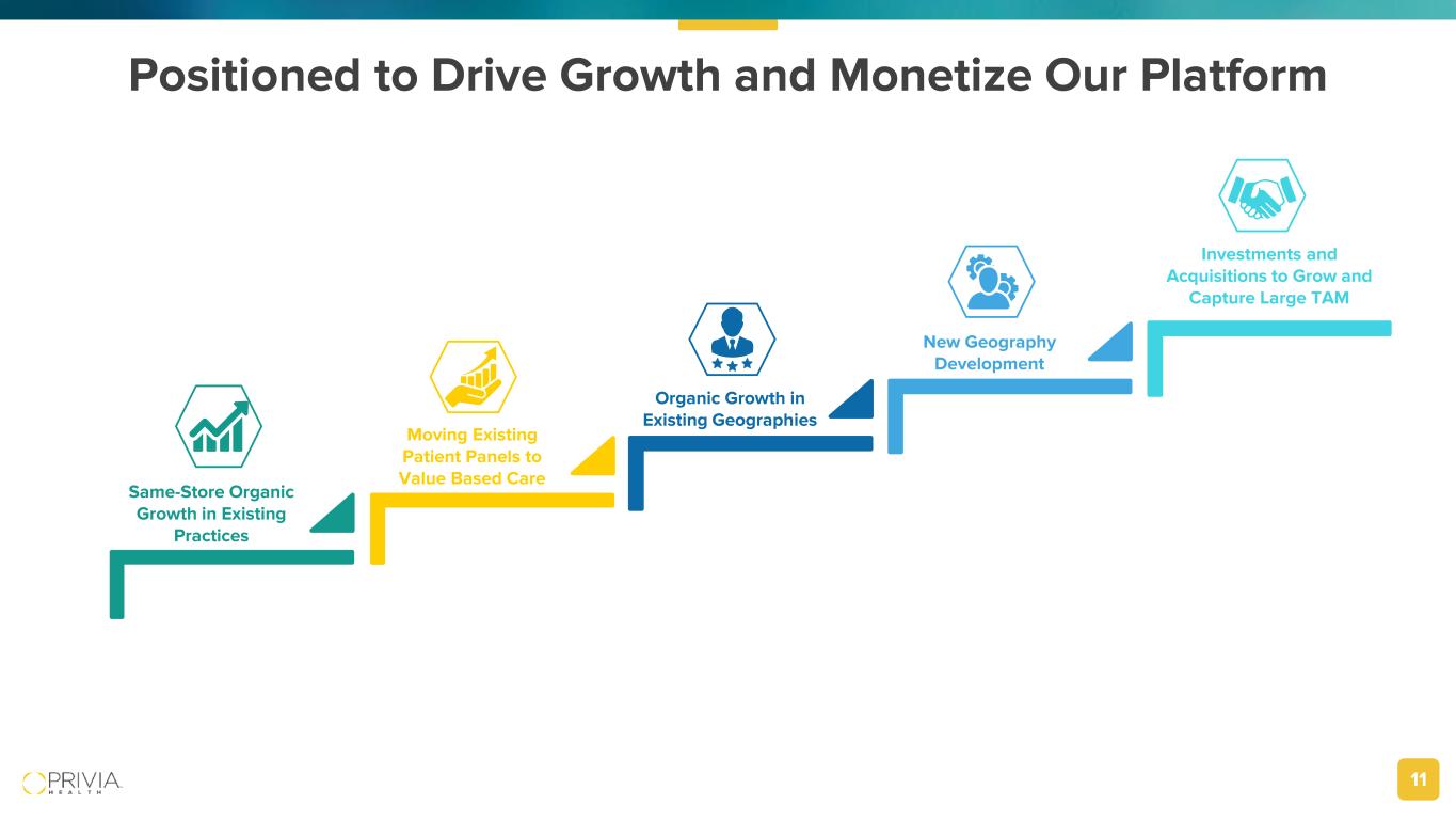 10 $160.8 $66.4 $83.0 $90.3 $26.8 $36.5 $27.5 $0.0 $50.0 $100.0 $150.0 $200.0 $250.0 FY2020 FY2021 9 Mos 2022 VBC Portion of Total GAAP Revenue 1 Capitation Shared Savings Care Mgmt Fees Momentum Across Diverse VBC Revenue Streams 11.4% of Total GAAP Revenue 12.4% 28.1% • Percentage of value-based care revenue more than doubled in 2022, with opportunity for growth • Managed $1.1+ Billion in Medical Spend in the CMS’ MSSP 2021 performance year, of which only Privia’s share of savings recognized in revenue 1 Based on data provided in the Revenue Recognition footnote of the Company’s most recent Form 10-K and 10-Q filed with the Securities and Exchange Commission