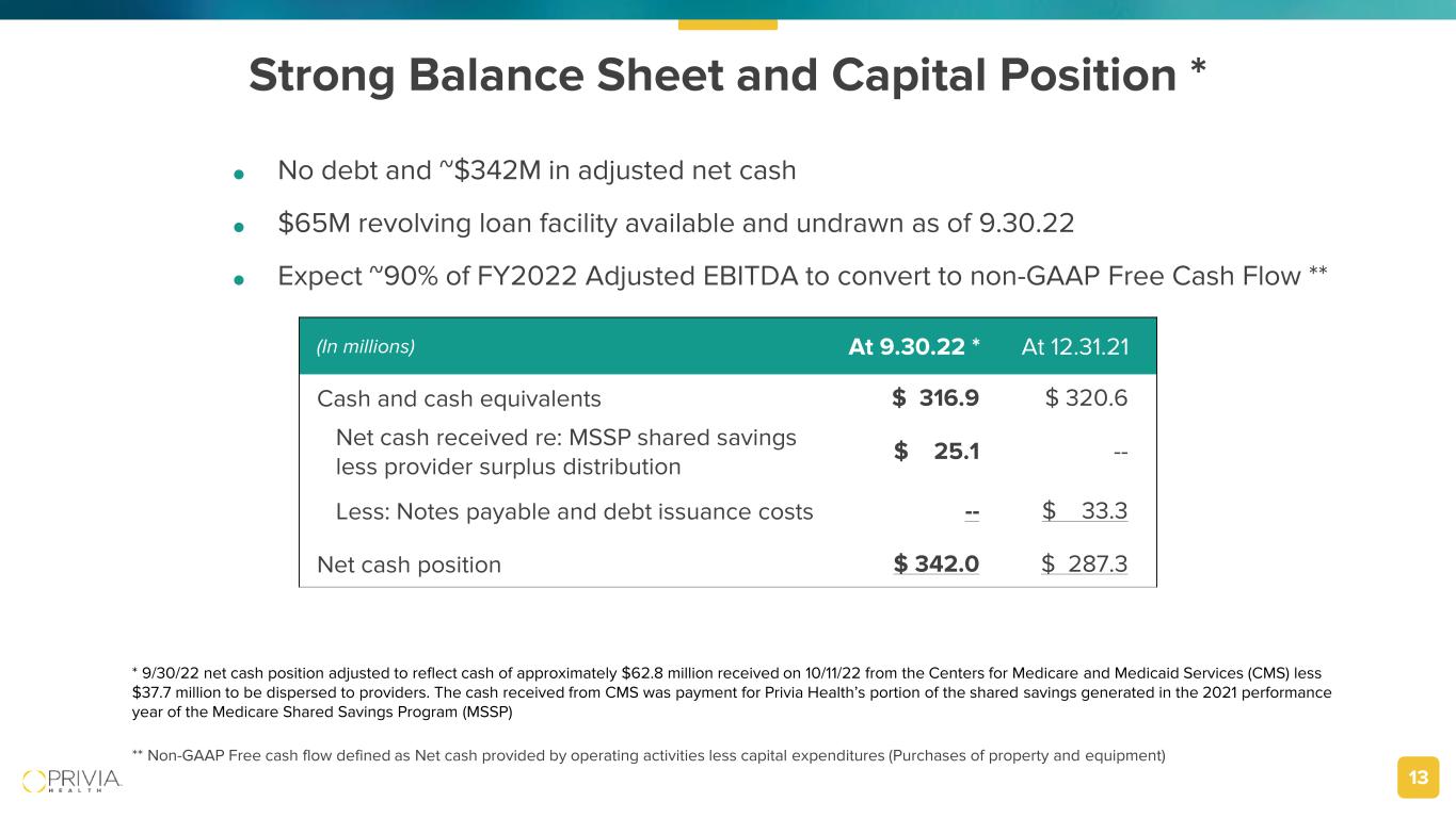 12 Strong Execution Since IPO FY 2020 FY 2022 est.* % Change States + DC 6 10 67% Implemented Providers 2,550 3,670 44% Attributed Lives 682,000 855,000 25% Practice Collections $1,301M $2,362M 82% Care Margin $ 188M $ 300M 60% Platform Contribution $ 83M $ 144M 73% Adjusted EBITDA $ 29M $ 60M 107% * Denotes midpoint of FY 2022 guidance ranges provided on November 10, 2022, except for number of states