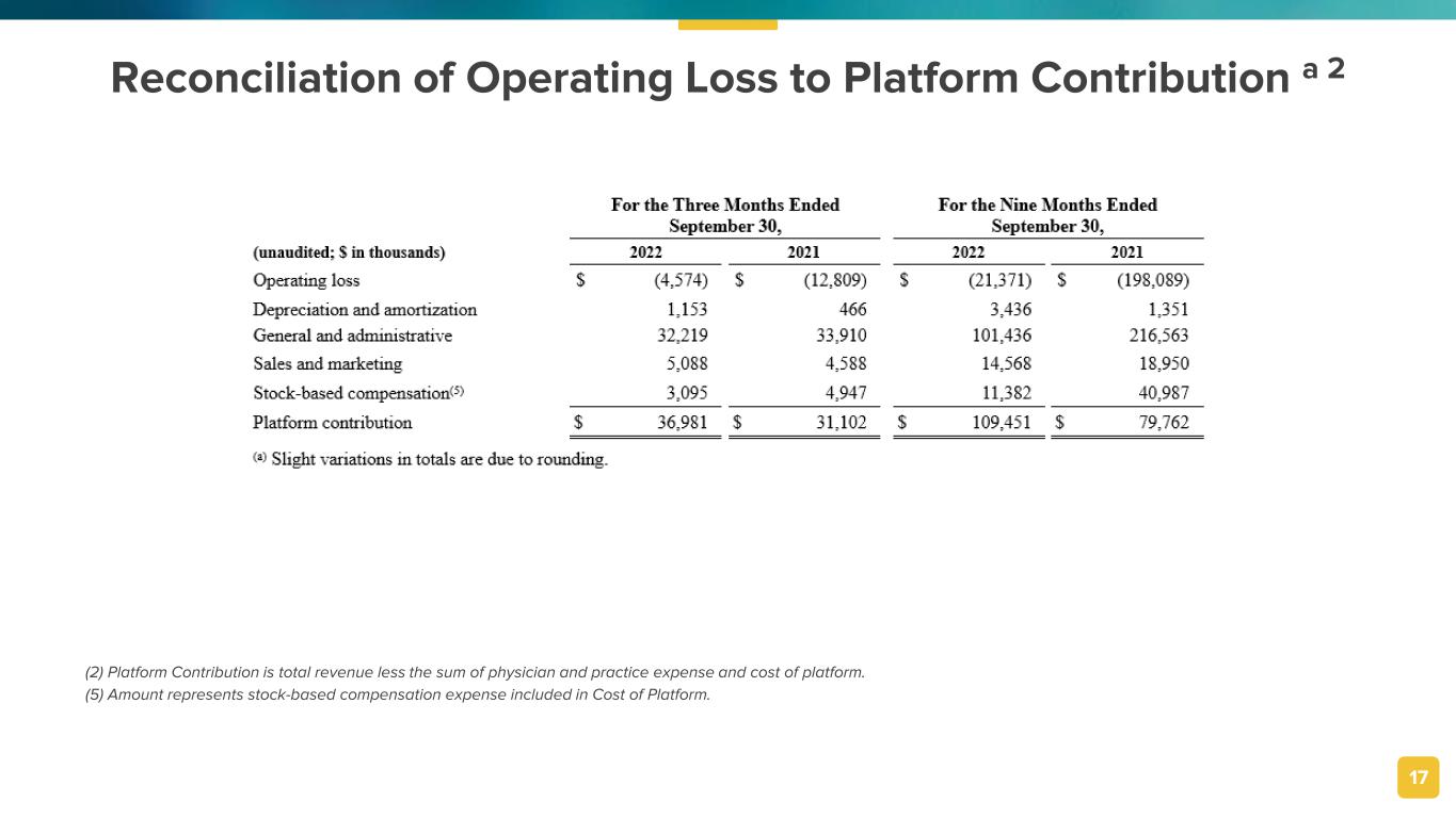 17 Reconciliation of Operating Loss to Platform Contribution a 2 (2) Platform Contribution is total revenue less the sum of physician and practice expense and cost of platform. (5) Amount represents stock-based compensation expense included in Cost of Platform.