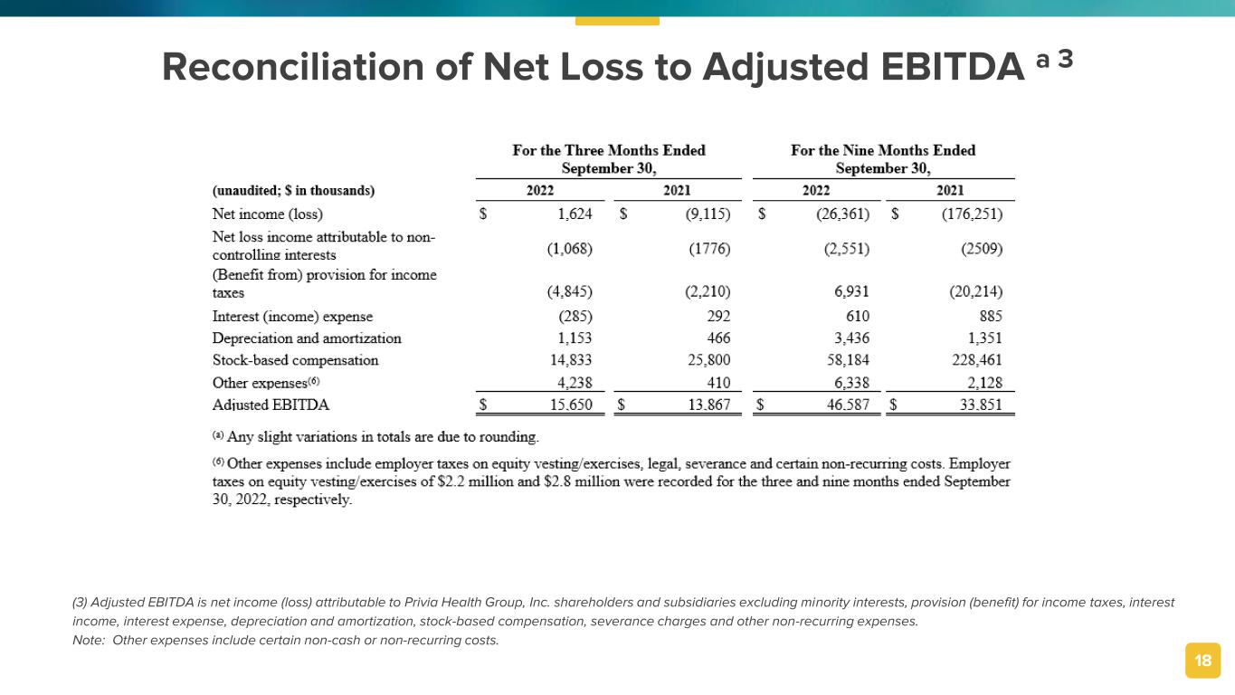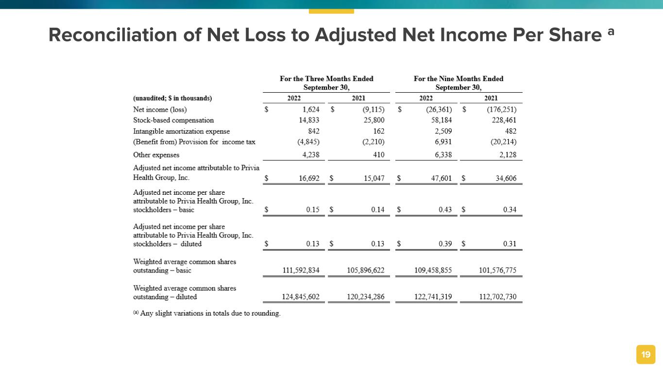 18 Reconciliation of Net Loss to Adjusted EBITDA a 3 (3) Adjusted EBITDA is net income (loss) attributable to Privia Health Group, Inc. shareholders and subsidiaries excluding minority interests, provision (benefit) for income taxes, interest income, interest expense, depreciation and amortization, stock-based compensation, severance charges and other non-recurring expenses. Note: Other expenses include certain non-cash or non-recurring costs.