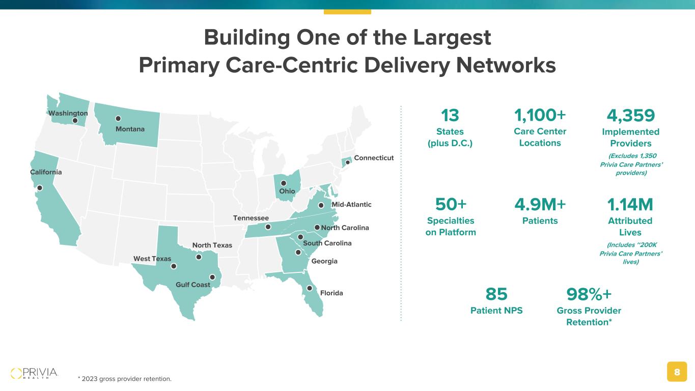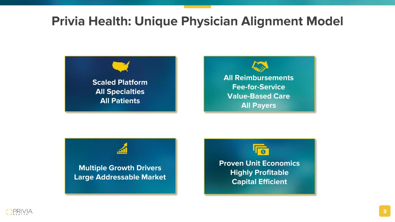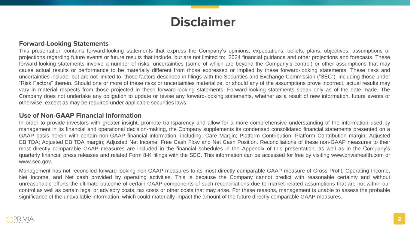 2 Forward-Looking Statements This presentation contains forward-looking statements that express the Company’s opinions, expectations, beliefs, plans, objectives, assumptions or projections regarding future events or future results that include, but are not limited to: 2024 financial guidance and other projections and forecasts. These forward-looking statements involve a number of risks, uncertainties (some of which are beyond the Company’s control) or other assumptions that may cause actual results or performance to be materially different from those expressed or implied by these forward-looking statements. These risks and uncertainties include, but are not limited to, those factors described in filings with the Securities and Exchange Commission (“SEC”), including those under “Risk Factors” therein. Should one or more of these risks or uncertainties materialize, or should any of the assumptions prove incorrect, actual results may vary in material respects from those projected in these forward-looking statements. Forward-looking statements speak only as of the date made. The Company does not undertake any obligation to update or revise any forward-looking statements, whether as a result of new information, future events or otherwise, except as may be required under applicable securities laws. Use of Non-GAAP Financial Information In order to provide investors with greater insight, promote transparency and allow for a more comprehensive understanding of the information used by management in its financial and operational decision-making, the Company supplements its condensed consolidated financial statements presented on a GAAP basis herein with certain non-GAAP financial information, including: Care Margin; Platform Contribution; Platform Contribution margin; Adjusted EBITDA; Adjusted EBITDA margin; Adjusted Net Income; Free Cash Flow and Net Cash Position. Reconciliations of these non-GAAP measures to their most directly comparable GAAP measures are included in the financial schedules in the Appendix of this presentation, as well as in the Company’s quarterly financial press releases and related Form 8-K filings with the SEC. This information can be accessed for free by visiting www.priviahealth.com or www.sec.gov. Management has not reconciled forward-looking non-GAAP measures to its most directly comparable GAAP measure of Gross Profit, Operating Income, Net Income, and Net cash provided by operating activities. This is because the Company cannot predict with reasonable certainty and without unreasonable efforts the ultimate outcome of certain GAAP components of such reconciliations due to market-related assumptions that are not within our control as well as certain legal or advisory costs, tax costs or other costs that may arise. For these reasons, management is unable to assess the probable significance of the unavailable information, which could materially impact the amount of the future directly comparable GAAP measures. Disclaimer