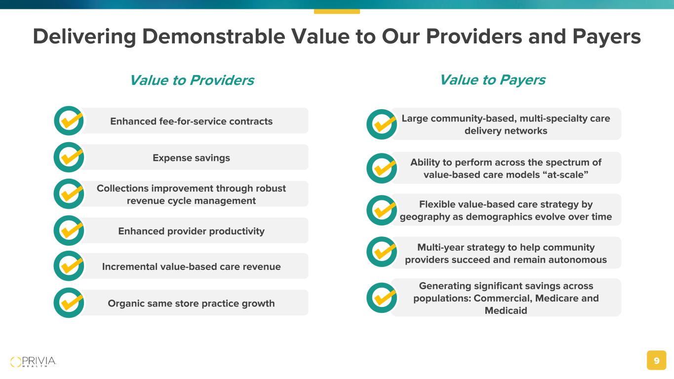 8 Building One of the Largest Primary Care-Centric Delivery Networks 1,100+ Care Center Locations 4,359 Implemented Providers (Excludes 1,350 Privia Care Partners’ providers) 13 States (plus D.C.) 4.9M+ Patients 1.14M Attributed Lives (Includes ~200K Privia Care Partners’ lives) Mid-Atlantic Tennessee Georgia Florida North Texas Gulf Coast California West Texas Montana 50+ Specialties on Platform Ohio North Carolina Connecticut Washington South Carolina 98%+ Gross Provider Retention* 85 Patient NPS * 2023 gross provider retention.
