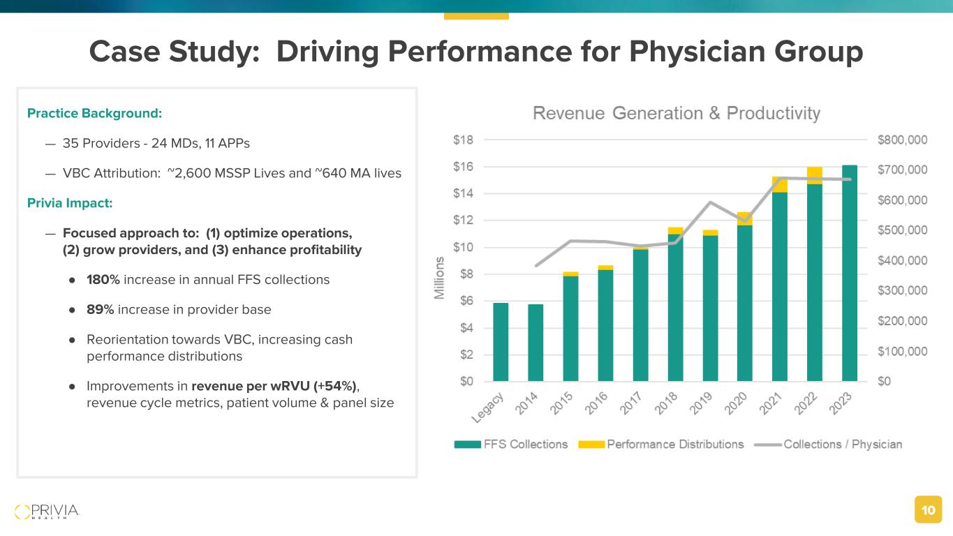 9 Enhanced fee-for-service contracts Delivering Demonstrable Value to Our Providers and Payers ✔ Large community-based, multi-specialty care delivery networks✔ Expense savings✔ Ability to perform across the spectrum of value-based care models “at-scale”✔ Collections improvement through robust revenue cycle management✔ Flexible value-based care strategy by geography as demographics evolve over time✔ Enhanced provider productivity ✔ Multi-year strategy to help community providers succeed and remain autonomous✔ Incremental value-based care revenue✔ Generating significant savings across populations: Commercial, Medicare and Medicaid ✔Organic same store practice growth✔ Value to Providers Value to Payers