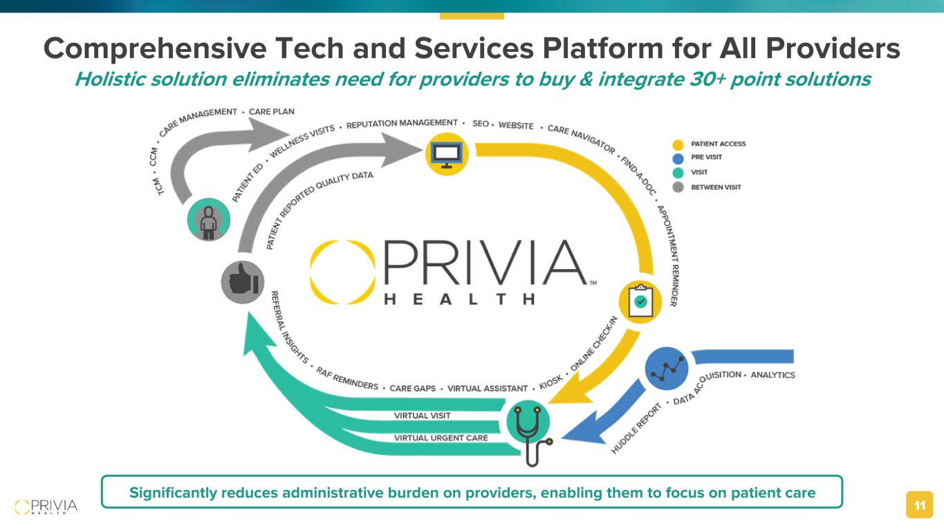 10 Case Study: Driving Performance for Physician Group Practice Background: — 35 Providers - 24 MDs, 11 APPs — VBC Attribution: ~2,600 MSSP Lives and ~640 MA lives Privia Impact: — Focused approach to: (1) optimize operations, (2) grow providers, and (3) enhance profitability ● 180% increase in annual FFS collections ● 89% increase in provider base ● Reorientation towards VBC, increasing cash performance distributions ● Improvements in revenue per wRVU (+54%), revenue cycle metrics, patient volume & panel size