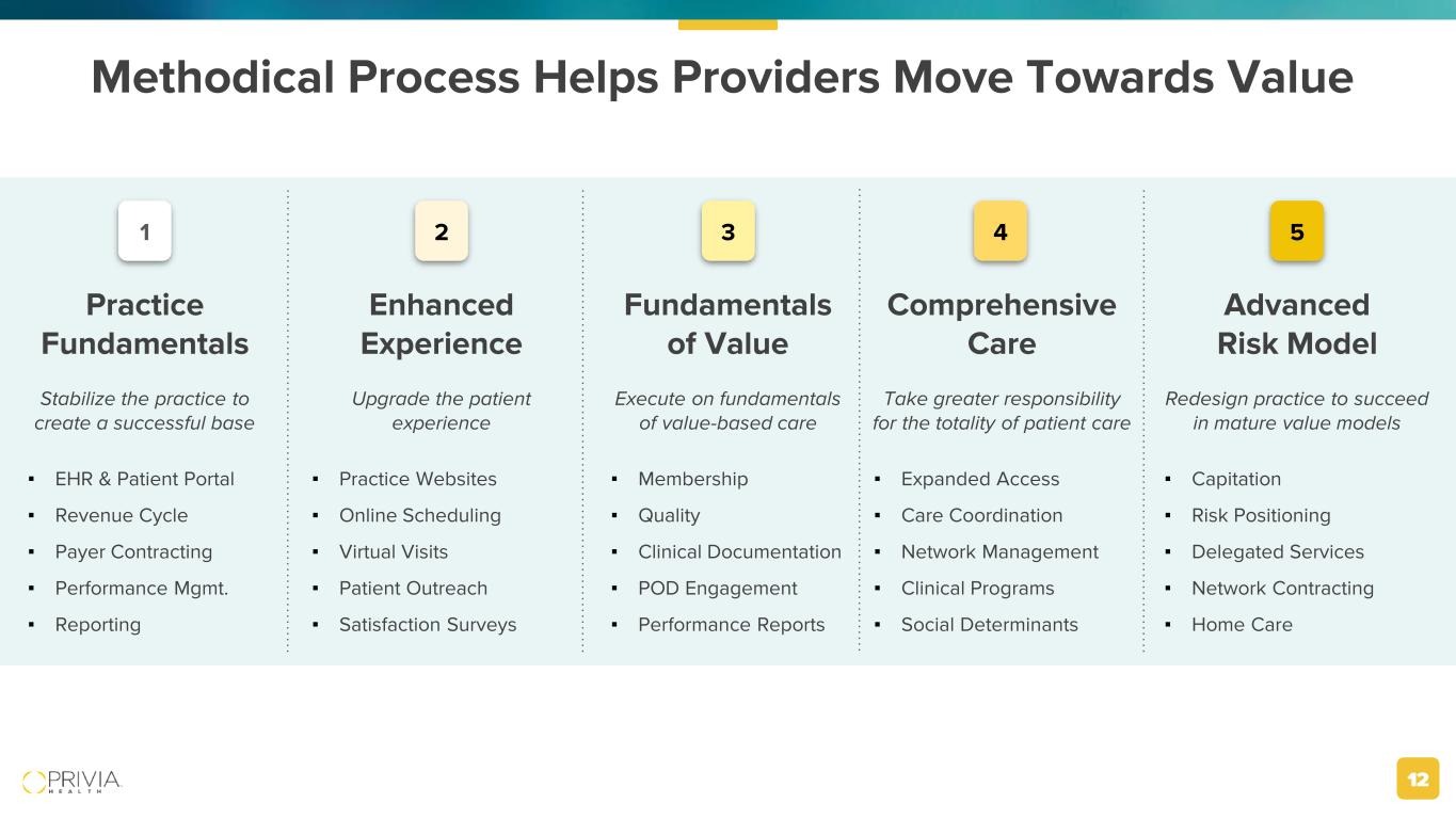 12 Methodical Process Helps Providers Move Towards Value Practice Fundamentals Stabilize the practice to create a successful base Enhanced Experience Upgrade the patient experience Fundamentals of Value Execute on fundamentals of value-based care Comprehensive Care Take greater responsibility for the totality of patient care Advanced Risk Model Redesign practice to succeed in mature value models 2 43 51 ▪ EHR & Patient Portal ▪ Revenue Cycle ▪ Payer Contracting ▪ Performance Mgmt. ▪ Reporting ▪ Practice Websites ▪ Online Scheduling ▪ Virtual Visits ▪ Patient Outreach ▪ Satisfaction Surveys ▪ Membership ▪ Quality ▪ Clinical Documentation ▪ POD Engagement ▪ Performance Reports ▪ Expanded Access ▪ Care Coordination ▪ Network Management ▪ Clinical Programs ▪ Social Determinants ▪ Capitation ▪ Risk Positioning ▪ Delegated Services ▪ Network Contracting ▪ Home Care