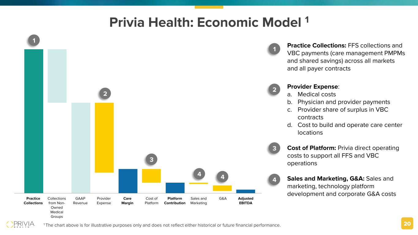 20 Privia Health: Economic Model 1 1 2 3 4 4 Practice Collections Collections from Non- Owned Medical Groups GAAP Revenue Provider Expense Care Margin Cost of Platform Platform Contribution Sales and Marketing G&A Adjusted EBITDA 1 Practice Collections: FFS collections and VBC payments (care management PMPMs and shared savings) across all markets and all payer contracts Provider Expense: a. Medical costs b. Physician and provider payments c. Provider share of surplus in VBC contracts d. Cost to build and operate care center locations Cost of Platform: Privia direct operating costs to support all FFS and VBC operations Sales and Marketing, G&A: Sales and marketing, technology platform development and corporate G&A costs 2 3 4 1 The chart above is for illustrative purposes only and does not reflect either historical or future financial performance.