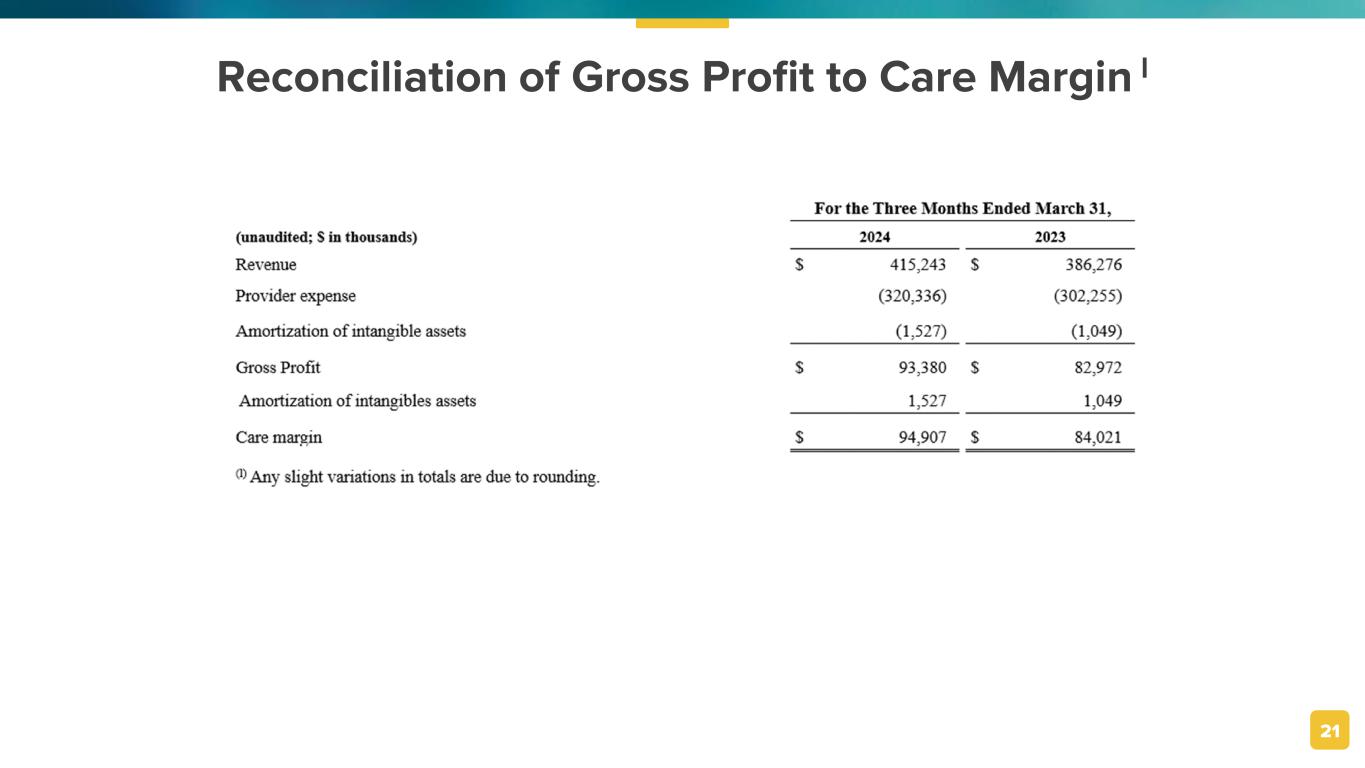 19 1Q’24 Performance 1 Implemented Providers (as of end of period) Attributed Lives (‘000s, as of end of period)1 Platform Contribution ($mm)Care Margin ($mm) Practice Collections ($mm) % Practice Collections 6.3% 6.1% % Care Margin 49.3% 47.2% Adjusted EBITDA ($mm) 1 Solid bar represents government lives and shaded bar represents commercial lives. Any slight variations in calculations due to rounding. For reconciliations of Care Margin to Gross Profit, Platform Contribution to Gross Profit, and Adjusted EBITDA to Net Income, please see the Appendix. % Practice Collections 2.6% 2.7% % Care Margin 20.7% 21.0% +7.4%+10.2%+17.3% +13.0% +8.1% +18.1%