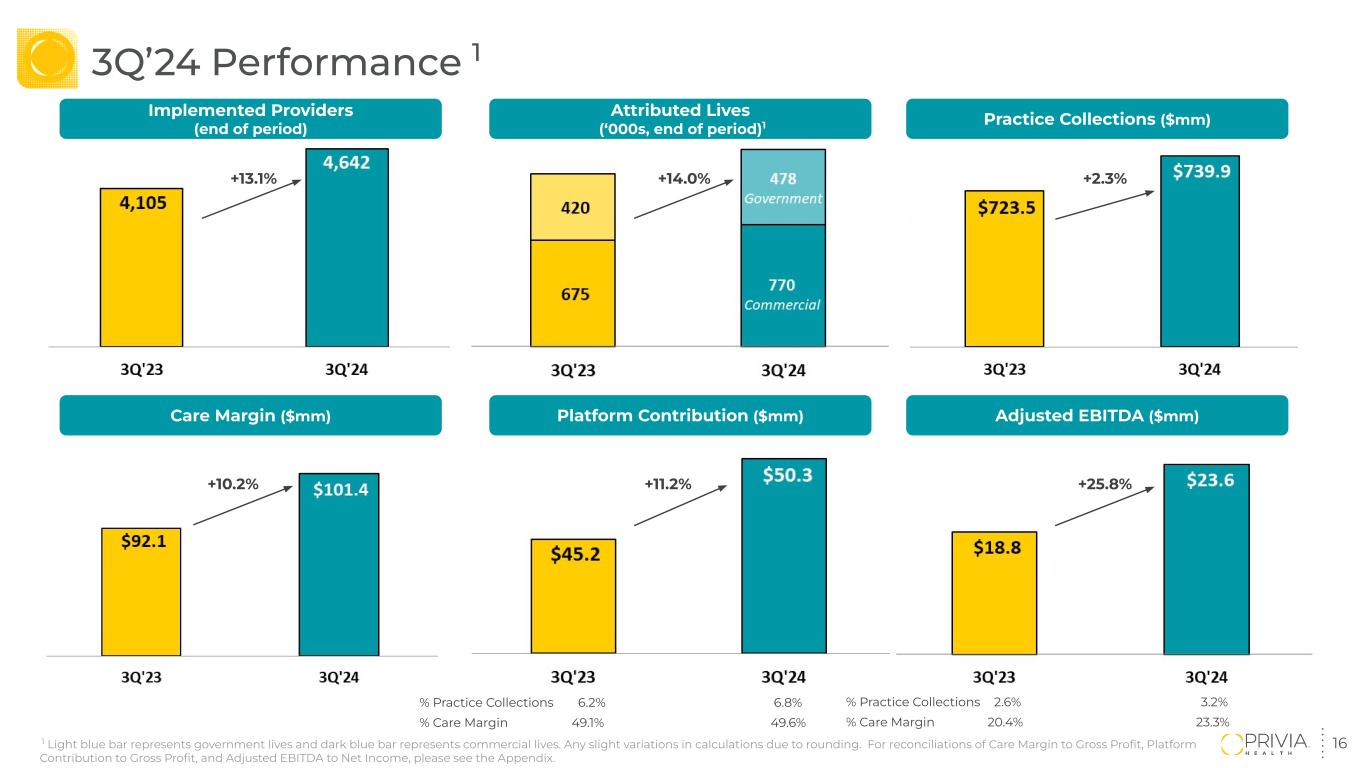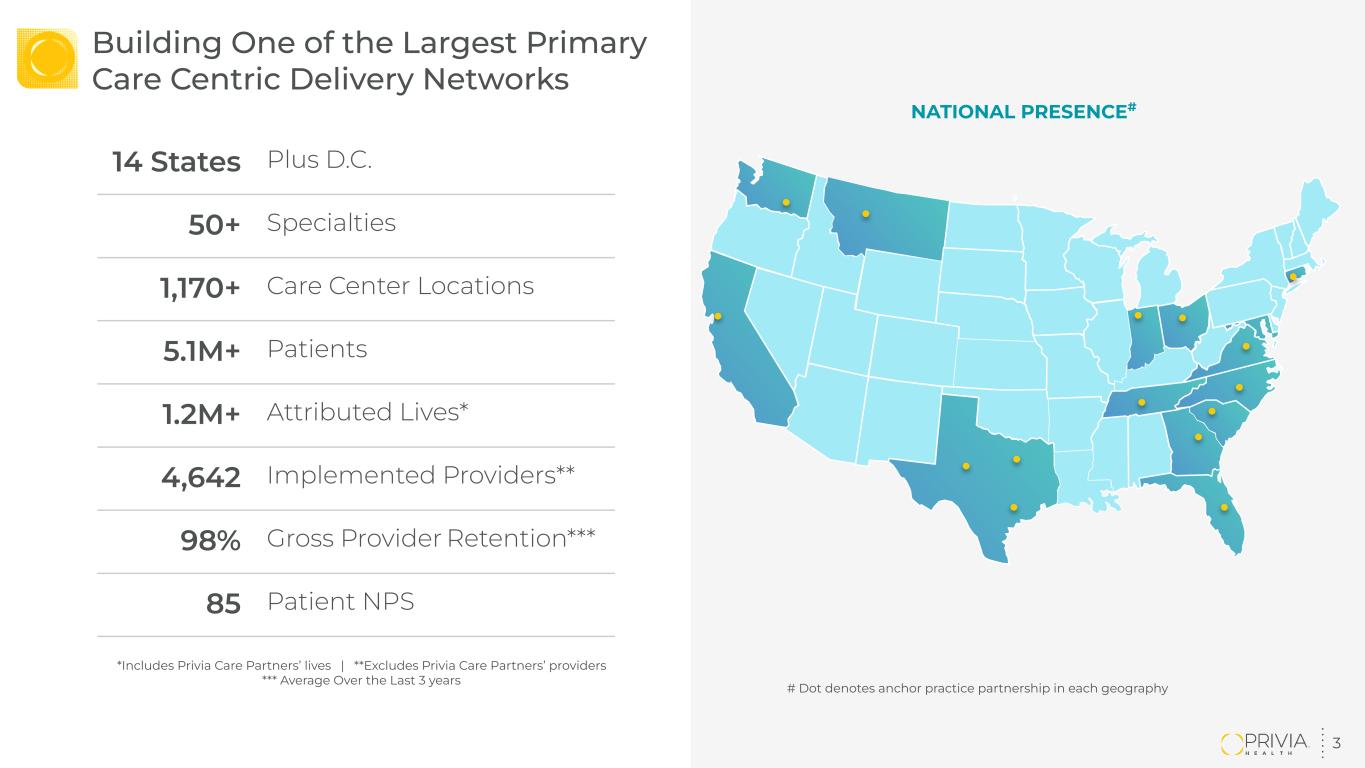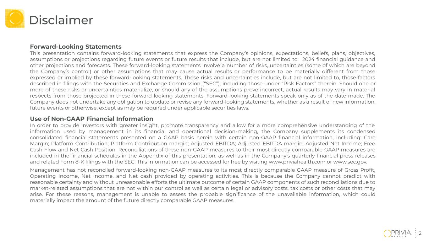Forward-Looking Statements This presentation contains forward-looking statements that express the Company’s opinions, expectations, beliefs, plans, objectives, assumptions or projections regarding future events or future results that include, but are not limited to: 2024 financial guidance and other projections and forecasts. These forward-looking statements involve a number of risks, uncertainties (some of which are beyond the Company’s control) or other assumptions that may cause actual results or performance to be materially different from those expressed or implied by these forward-looking statements. These risks and uncertainties include, but are not limited to, those factors described in filings with the Securities and Exchange Commission (“SEC”), including those under “Risk Factors” therein. Should one or more of these risks or uncertainties materialize, or should any of the assumptions prove incorrect, actual results may vary in material respects from those projected in these forward-looking statements. Forward-looking statements speak only as of the date made. The Company does not undertake any obligation to update or revise any forward-looking statements, whether as a result of new information, future events or otherwise, except as may be required under applicable securities laws. Use of Non-GAAP Financial Information In order to provide investors with greater insight, promote transparency and allow for a more comprehensive understanding of the information used by management in its financial and operational decision-making, the Company supplements its condensed consolidated financial statements presented on a GAAP basis herein with certain non-GAAP financial information, including: Care Margin; Platform Contribution; Platform Contribution margin; Adjusted EBITDA; Adjusted EBITDA margin; Adjusted Net Income; Free Cash Flow and Net Cash Position. Reconciliations of these non-GAAP measures to their most directly comparable GAAP measures are included in the financial schedules in the Appendix of this presentation, as well as in the Company’s quarterly financial press releases and related Form 8-K filings with the SEC. This information can be accessed for free by visiting www.priviahealth.com or www.sec.gov. Management has not reconciled forward-looking non-GAAP measures to its most directly comparable GAAP measure of Gross Profit, Operating Income, Net Income, and Net cash provided by operating activities. This is because the Company cannot predict with reasonable certainty and without unreasonable efforts the ultimate outcome of certain GAAP components of such reconciliations due to market-related assumptions that are not within our control as well as certain legal or advisory costs, tax costs or other costs that may arise. For these reasons, management is unable to assess the probable significance of the unavailable information, which could materially impact the amount of the future directly comparable GAAP measures. 2 Disclaimer