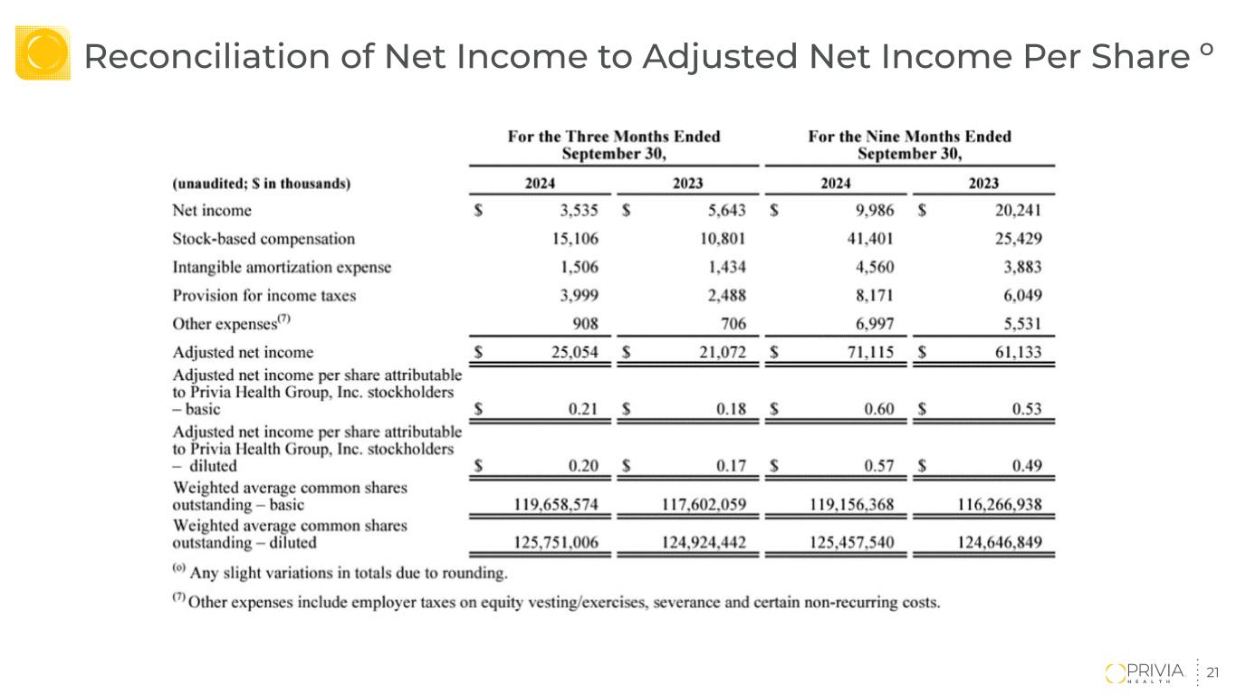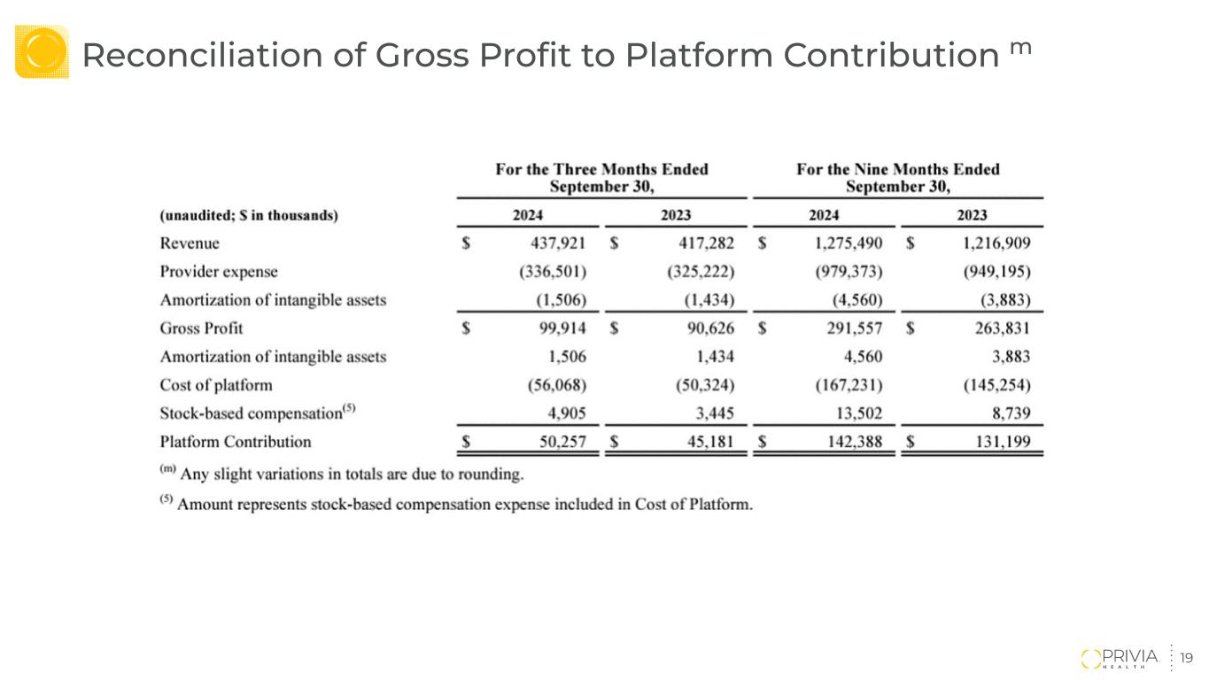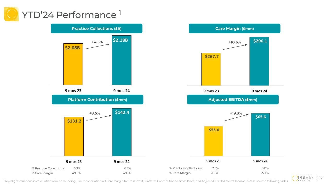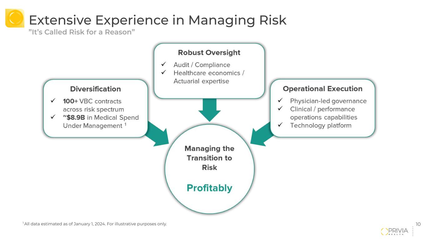 Forward-Looking Statements This presentation contains forward-looking statements that express the Company’s opinions, expectations, beliefs, plans, objectives, assumptions or projections regarding future events or future results that include, but are not limited to: 2024 financial guidance and other projections and forecasts. These forward-looking statements involve a number of risks, uncertainties (some of which are beyond the Company’s control) or other assumptions that may cause actual results or performance to be materially different from those expressed or implied by these forward-looking statements. These risks and uncertainties include, but are not limited to, those factors described in filings with the Securities and Exchange Commission (“SEC”), including those under “Risk Factors” therein. Should one or more of these risks or uncertainties materialize, or should any of the assumptions prove incorrect, actual results may vary in material respects from those projected in these forward-looking statements. Forward-looking statements speak only as of the date made. The Company does not undertake any obligation to update or revise any forward-looking statements, whether as a result of new information, future events or otherwise, except as may be required under applicable securities laws. Use of Non-GAAP Financial Information In order to provide investors with greater insight, promote transparency and allow for a more comprehensive understanding of the information used by management in its financial and operational decision-making, the Company supplements its condensed consolidated financial statements presented on a GAAP basis herein with certain non-GAAP financial information, including: Care Margin; Platform Contribution; Platform Contribution margin; Adjusted EBITDA; Adjusted EBITDA margin; Adjusted Net Income; Free Cash Flow and Net Cash Position. Reconciliations of these non-GAAP measures to their most directly comparable GAAP measures are included in the financial schedules in the Appendix of this presentation, as well as in the Company’s quarterly financial press releases and related Form 8-K filings with the SEC. This information can be accessed for free by visiting www.priviahealth.com or www.sec.gov. Management has not reconciled forward-looking non-GAAP measures to its most directly comparable GAAP measure of Gross Profit, Operating Income, Net Income, and Net cash provided by operating activities. This is because the Company cannot predict with reasonable certainty and without unreasonable efforts the ultimate outcome of certain GAAP components of such reconciliations due to market-related assumptions that are not within our control as well as certain legal or advisory costs, tax costs or other costs that may arise. For these reasons, management is unable to assess the probable significance of the unavailable information, which could materially impact the amount of the future directly comparable GAAP measures. 2 Disclaimer