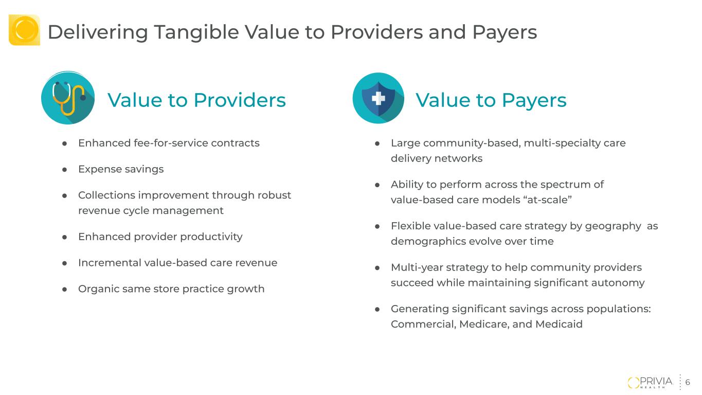 Consistent, Replicable Strategy Across all Geographies 5 Enter Market Organize Providers ● Community physicians ● Health systems ● Clinically Integrated Networks (CINs) ● Independent Physician Associations (IPAs) ● Other facility-based providers Drive Growth & Profitability ● Fee-For-Service (FFS) & Value-Based Care (VBC) ● Same-store growth ● Value-added ancillary services Transition at Scale to Value & Risk ● Commercial ● MSSP ● Medicare / MA ● Medicaid ● Single-TIN multi-specialty medical group ● Risk-bearing entity ● Tech / services platform ● Physician-led governance