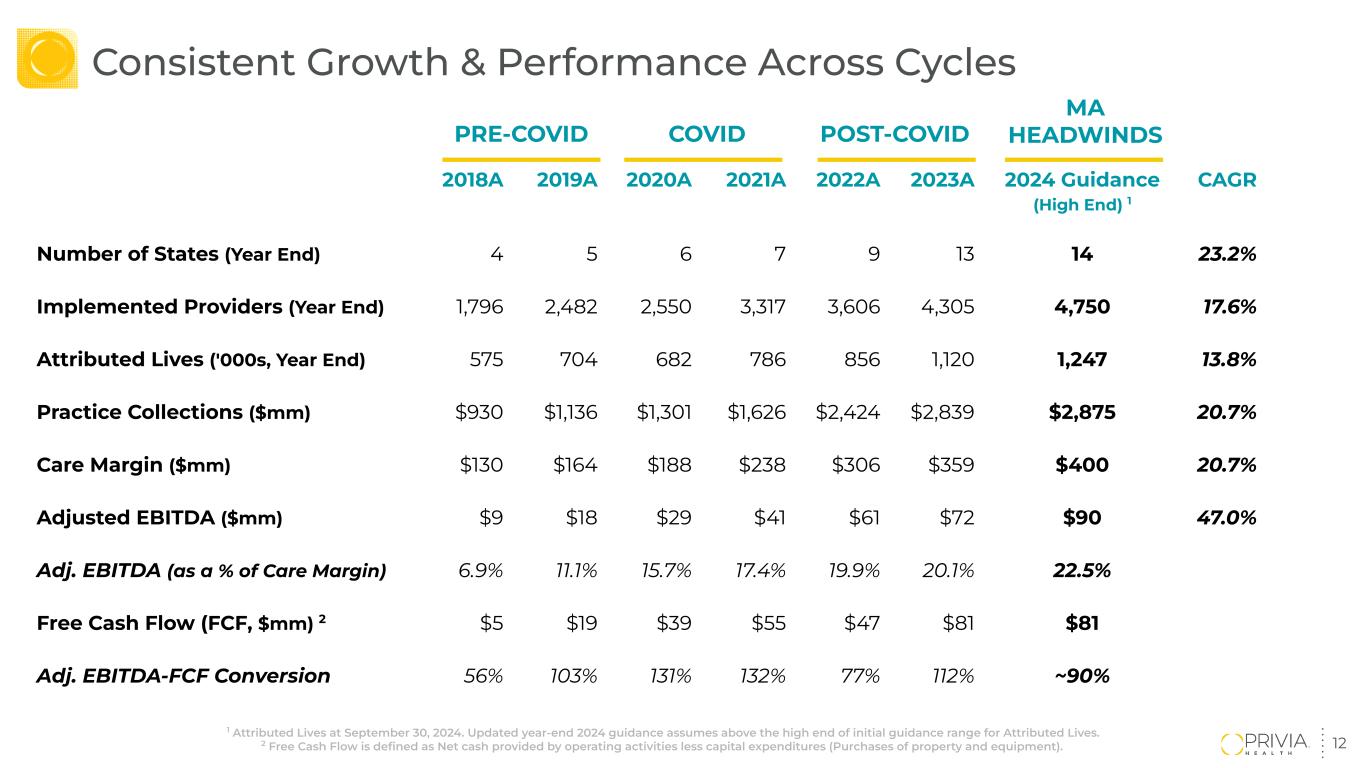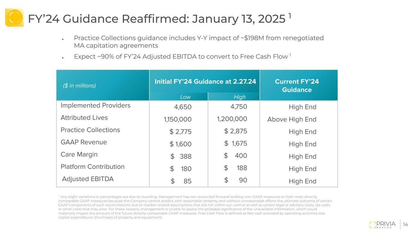 FY’24 Guidance Reaffirmed: January 13, 2025 1 14   ($ in millions)    Initial FY’24 Guidance at 2.27.24 Current FY’24 Guidance  Low High Implemented Providers Attributed Lives Practice Collections GAAP Revenue Care Margin Platform Contribution Adjusted EBITDA 4,650 4,750 1,200,000 $ 2,875 $ 1,675 $ 400 $ 188 $ 90 High End   1,150,000 Above High End   $ 2,775 High End   $ 1,600 High End   $ 388 High End   $ 180 High End   $ 85 High End   1 Any slight variations in percentages are due to rounding. Management has not reconciled forward-looking non-GAAP measures to their most directly comparable GAAP measures because the Company cannot predict with reasonable certainty and without unreasonable efforts the ultimate outcome of certain GAAP components of such reconciliations due to market-related assumptions that are not within our control as well as certain legal or advisory costs, tax costs or other costs that may arise. For these reasons, management is unable to assess the probable significance of the unavailable information, which could materially impact the amount of the future directly comparable GAAP measures. Free Cash Flow is defined as Net cash provided by operating activities less capital expenditures (Purchases of property and equipment). ● Practice Collections guidance includes Y-Y impact of ~$198M from renegotiated MA capitation agreements ● Expect ~90% of FY’24 Adjusted EBITDA to convert to Free Cash Flow 1