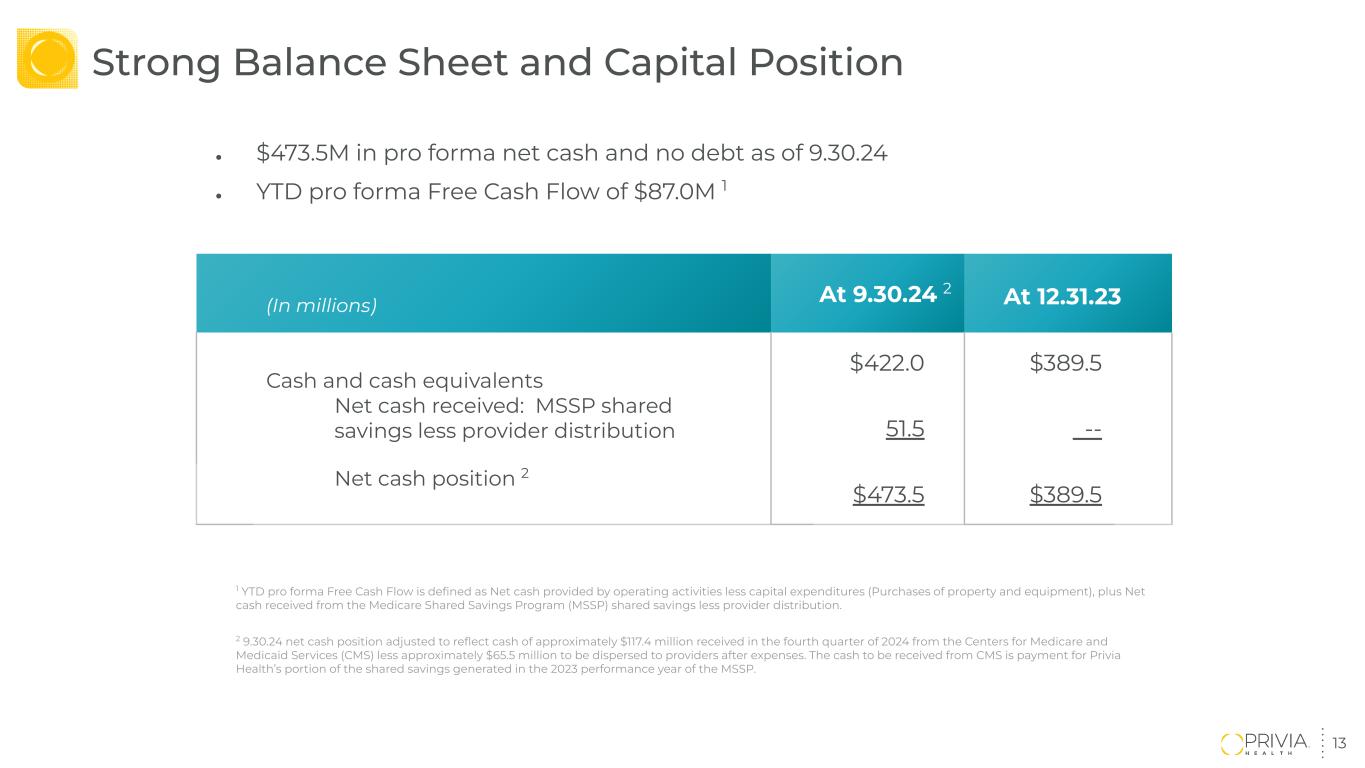 Consistent Growth & Performance Across Cycles 12 2018A 2019A 2020A 2021A 2022A 2023A 2024 Guidance (High End) 1 CAGR Number of States (Year End) 4 5 6 7 9 13 14 23.2% Implemented Providers (Year End) 1,796 2,482 2,550 3,317 3,606 4,305 4,750 17.6% Attributed Lives ('000s, Year End) 575 704 682 786 856 1,120 1,247 13.8% Practice Collections ($mm) $930 $1,136 $1,301 $1,626 $2,424 $2,839 $2,875 20.7% Care Margin ($mm) $130 $164 $188 $238 $306 $359 $400 20.7% Adjusted EBITDA ($mm) $9 $18 $29 $41 $61 $72 $90 47.0% Adj. EBITDA (as a % of Care Margin) 6.9% 11.1% 15.7% 17.4% 19.9% 20.1% 22.5% Free Cash Flow (FCF, $mm) 2 $5 $19 $39 $55 $47 $81 $81 Adj. EBITDA-FCF Conversion 56% 103% 131% 132% 77% 112% ~90% 1 Attributed Lives at September 30, 2024. Updated year-end 2024 guidance assumes above the high end of initial guidance range for Attributed Lives. 2 Free Cash Flow is defined as Net cash provided by operating activities less capital expenditures (Purchases of property and equipment). PRE-COVID COVID POST-COVID MA HEADWINDS