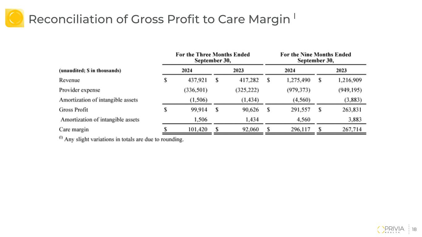 YTD’24 Performance 1 17 Platform Contribution ($mm) Care Margin ($mm)Practice Collections ($B) % Practice Collections 6.3% 6.5% % Care Margin 49.0% 48.1% Adjusted EBITDA ($mm) % Practice Collections 2.6% 3.0% % Care Margin 20.5% 22.1% +4.5% +10.6% +8.5% +19.3% 1 Any slight variations in calculations due to rounding. For reconciliations of Care Margin to Gross Profit, Platform Contribution to Gross Profit, and Adjusted EBITDA to Net Income, please see the following slides.