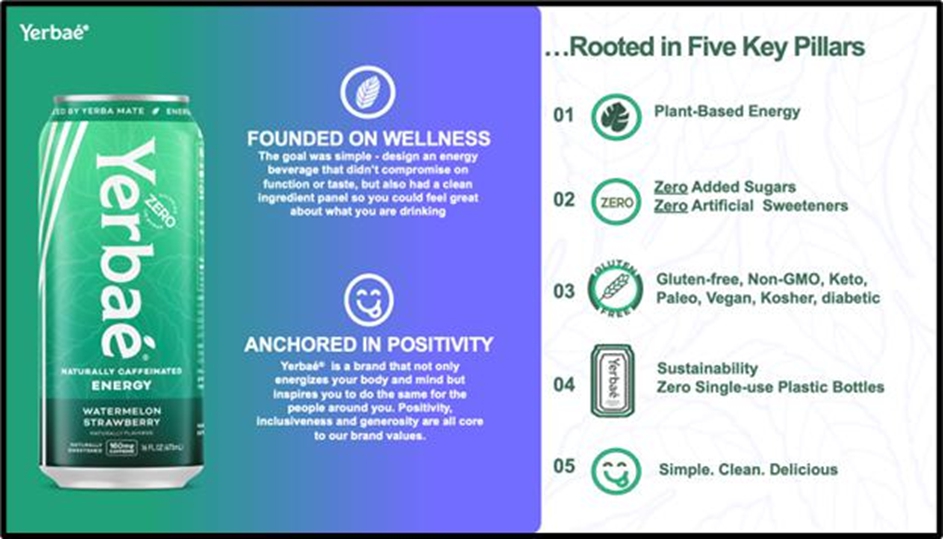 To support those 5 key pillars, Yerbaé has undertaken significant marketing efforts aimed at building brand awareness, including digital, social media, sponsorships, TV, and podcasts. Yerbaé also undertakes various promotions at the retail level such as display activity, coupons and other in-store incentives and sampling.