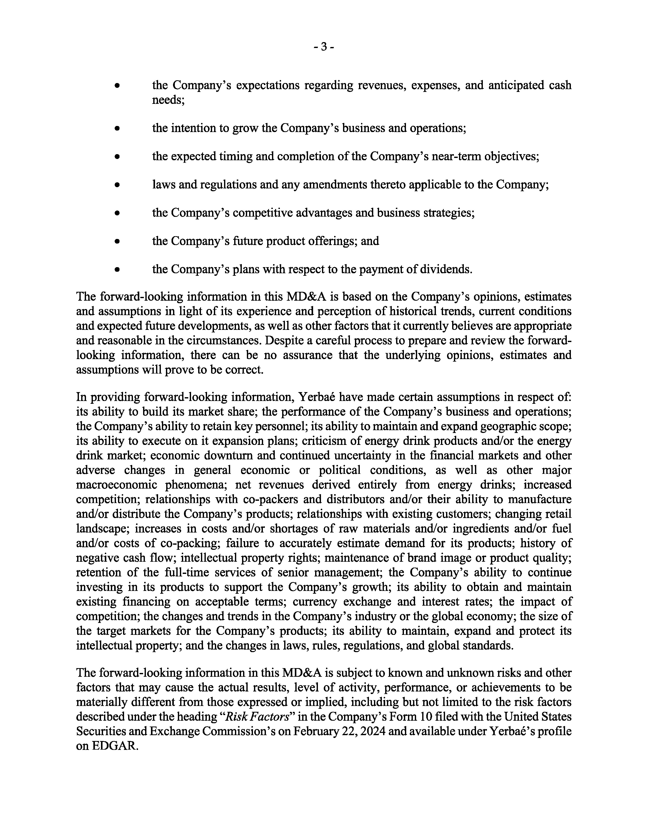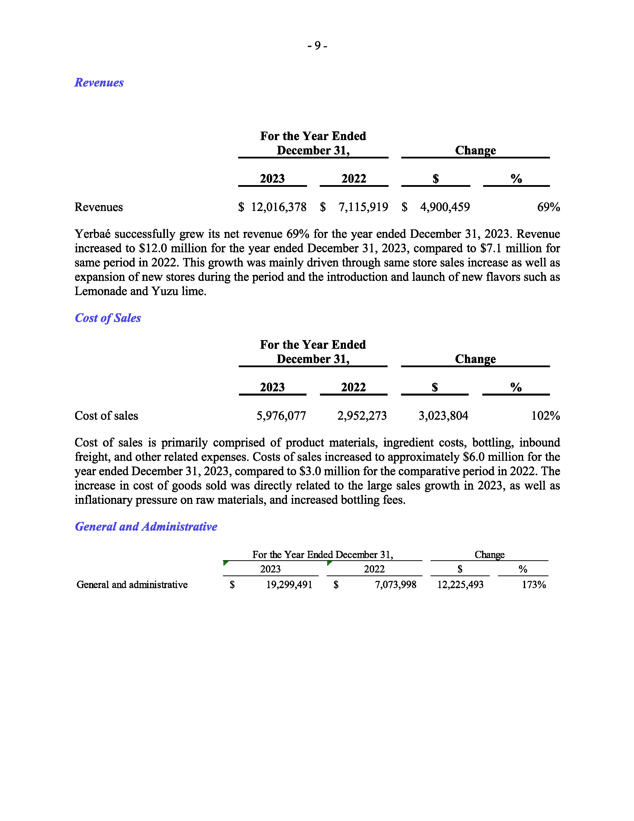 Yerbaé’s revenues declined by $5.4 million, or 54%, for the nine months ended September 30, 2024, compared to the same period in the prior year. Throughout this period, the Company prioritized optimizing its customer base by phasing out less profitable accounts, including previously announced exits from Sam’s Club and other high-slotting, low-volume retailers, which resulted in lower revenues for the nine-month period ended September 30, 2024 compared to the prior period. Yerbaé has instead focused on growth-oriented retail partnerships that enhance gross margins and deliver greater shareholder value. Significant progress was made in core focus channels, establishing a strong foundation for future growth. The Company also expanded its Direct-to-Consumer segment, introducing new variety packs and increasing brand awareness through a broader network of social media influencers and digital advertising. Additionally, Yerbaé strengthened its distributor relationships, onboarding 14 new distributors in the third quarter of 2024 to support its growth initiates for 2025 and beyond. Nine-month 2024 revenues were also impacted by the challenging CPG U.S. market, which has been impacted by higher inflation earlier in the period and as the Company transitioned from 16oz to 12 oz packaging, aligning with consumer demand for a more efficient product size, however this also resulted in decreased sales as the Company transitioned to the new can format. This transition was completed in Q2 2024.
