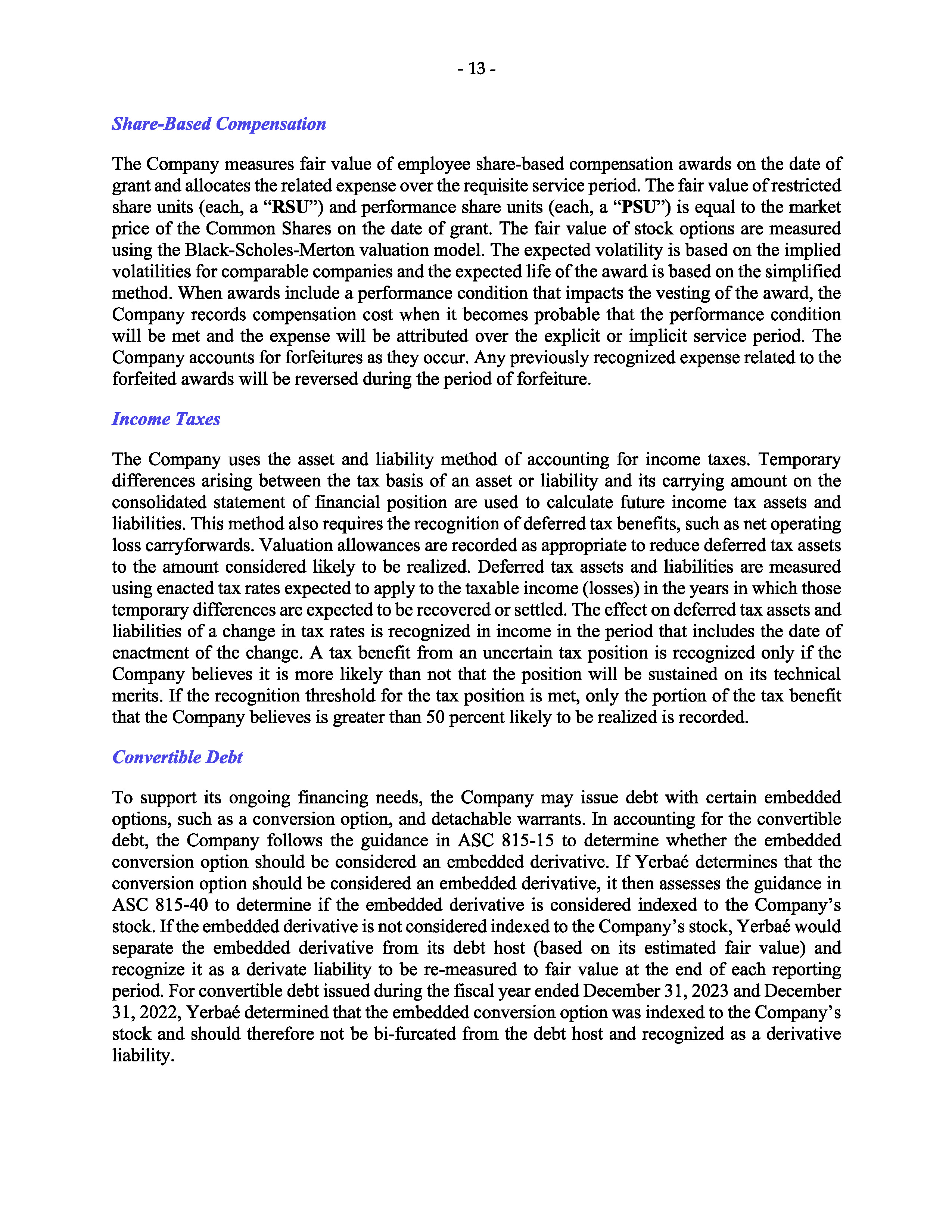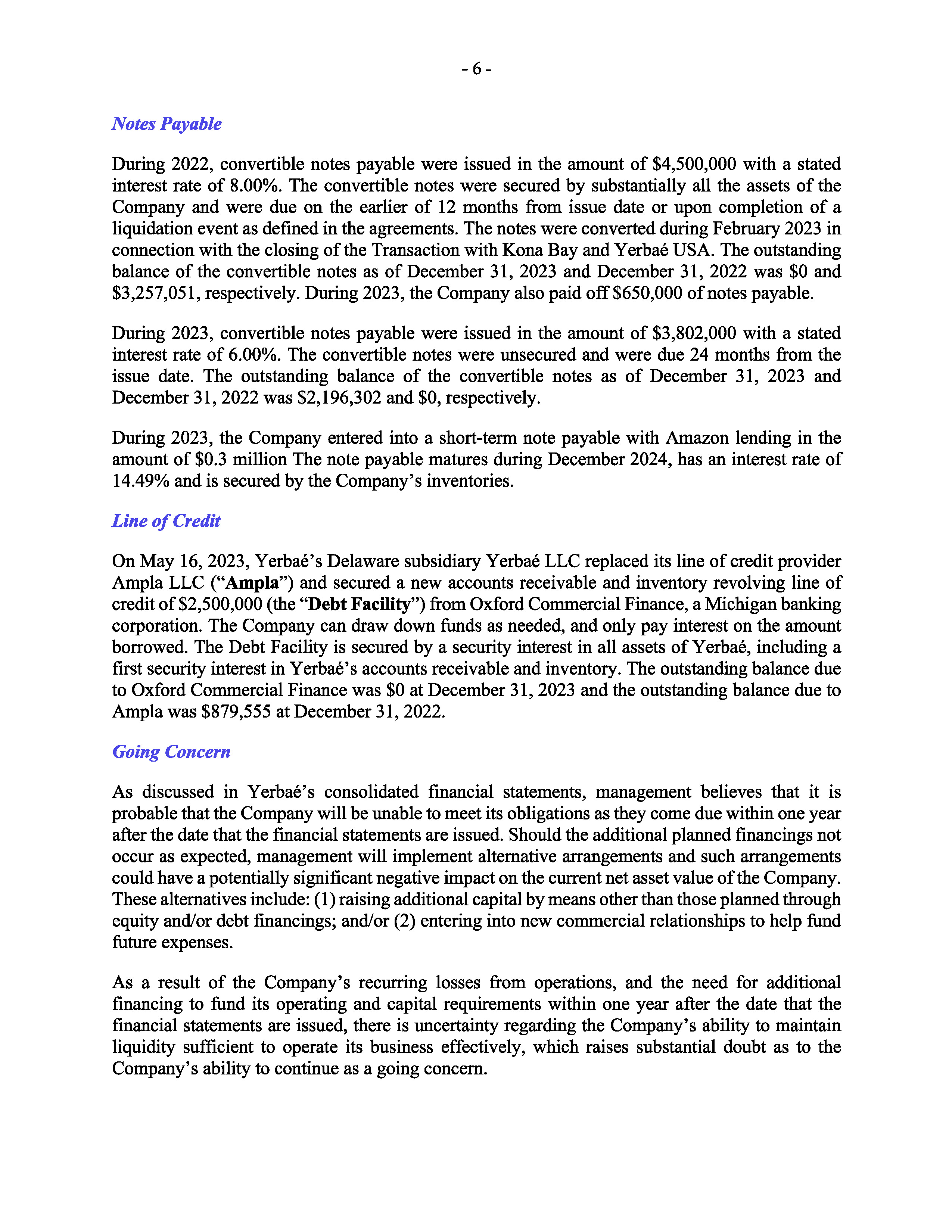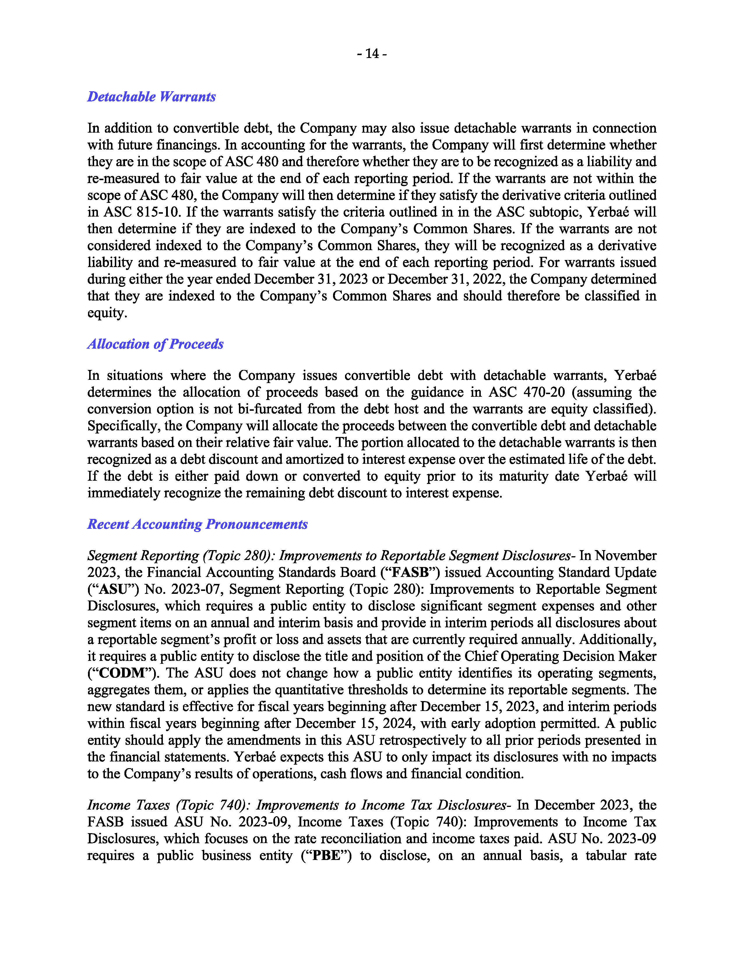 Yerbaé’s evaluation of its ability to continue as a going concern requires it to evaluate its future sources and uses of cash sufficient to fund its currently expected operations in conducting business activities one year from the date the financial statements are issued. Yerbaé evaluates the probability associated with each source and use of cash resources in making its going concern determination.