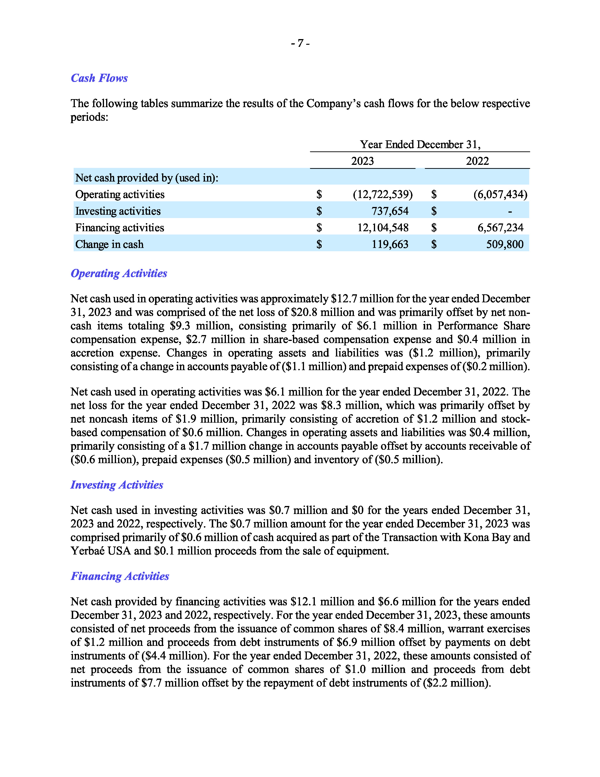 The Company did not engage in any material investing activities during the nine months ended September 30, 2024. Net cash provided from investing activities for the nine months ended September 30, 2023 was $0.6 million. The $0.6 million amount for the nine months ended September 30, 2023, was comprised primarily of $0.6 million of cash acquired as part of the reverse merger with Kona Bay.
