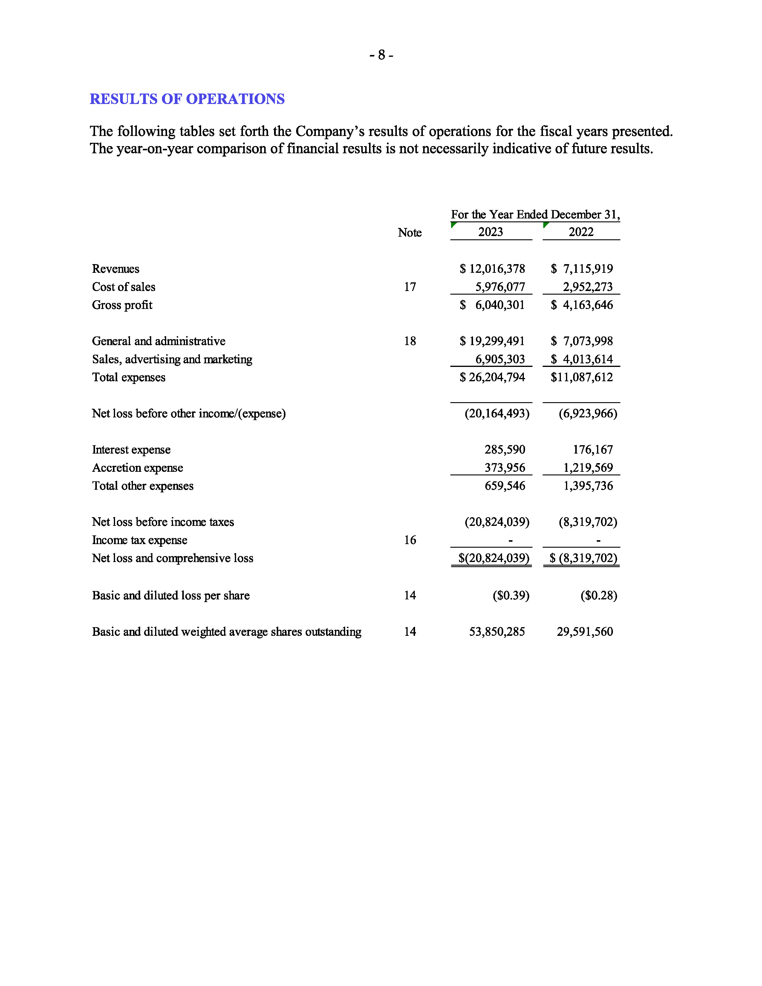 As of September 30, 2024, and December 31, 2023, the Company had a working capital deficit of $5,095,669 and surplus of $843,478, respectively. The Company has incurred losses since inception and as of September 30, 2024, and December 31, 2023, had an accumulated deficit of approximately $41.5 million and $34.5 million, respectively. The Company’s objective in managing its capital is to ensure that there is sufficient liquidity to finance and grow its operations, maximize the preservation of capital, provide adequate capital to fund its business objectives, and deliver competitive returns on invested capital. To fund its activities, the Company has primarily relied on private placement financing, warrant exercises, loans and other forms of debt. The material debt financing and loan transactions were as follows: