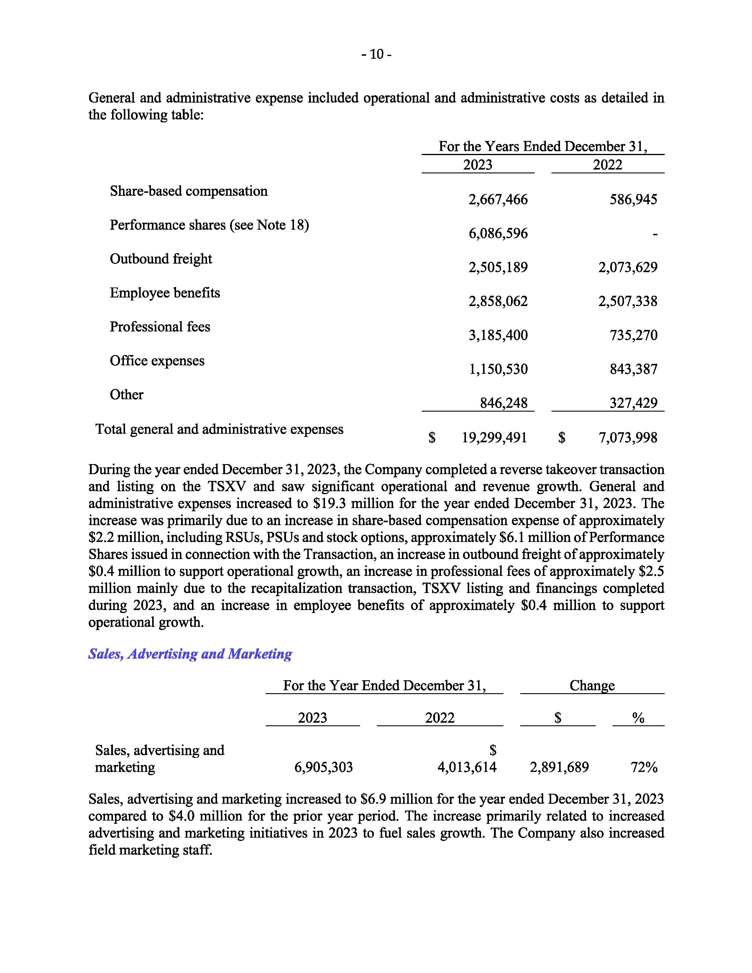 General and administrative expenses decreased to $7.5 million for the nine months ended September 30, 2024. The decrease was primarily due to a decrease in expense related to performance shares granted upon consummation of the reverse takeover during the nine months ended September 30, 2023, of $6.1 million, a decrease of professional fees of $0.9 million, a decrease of outbound freight of $0.6 million, a decrease of employee benefits of $0.5 million and a decrease of other expenses $0.2 million.