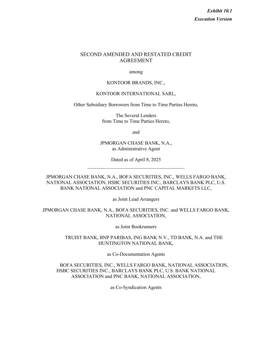 Execution Version SECOND AMENDED AND RESTATED CREDIT AGREEMENT among KONTOOR BRANDS, INC., KONTOOR INTERNATIONAL SARL, Other Subsidiary Borrowers from Time to Time Parties Hereto, The Several Lenders from Time to Time Parties Hereto, and JPMORGAN CHASE BANK, N.A., as Administrative Agent Dated as of April 8, 2025 JPMORGAN CHASE BANK, N.A., BOFA SECURITIES, INC., WELLS FARGO BANK, NATIONAL ASSOCIATION, HSBC SECURITIES INC., BARCLAYS BANK PLC, U.S. BANK NATIONAL ASSOCIATION and PNC CAPITAL MARKETS LLC, as Joint Lead Arrangers JPMORGAN CHASE BANK, N.A., BOFA SECURITIES, INC. and WELLS FARGO BANK, NATIONAL ASSOCIATION, as Joint Bookrunners TRUIST BANK, BNP PARIBAS, ING BANK N.V., TD BANK, N.A. and THE HUNTINGTON NATIONAL BANK, as Co-Documentation Agents BOFA SECURITIES, INC., WELLS FARGO BANK, NATIONAL ASSOCIATION, HSBC SECURITIES INC., BARCLAYS BANK PLC, U.S. BANK NATIONAL ASSOCIATION and PNC BANK, NATIONAL ASSOCIATION, as Co-Syndication Agents Exhibit 10.1
