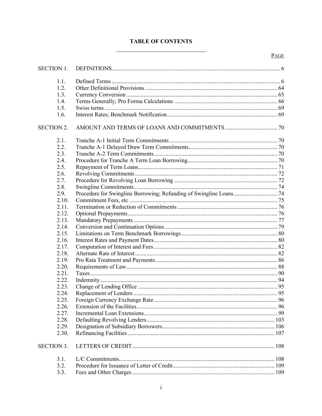i TABLE OF CONTENTS PAGE SECTION 1. DEFINITIONS .................................................................................................................... 6 1.1. Defined Terms .................................................................................................................... 6 1.2. Other Definitional Provisions ........................................................................................... 64 1.3. Currency Conversion ........................................................................................................ 65 1.4. Terms Generally; Pro Forma Calculations ....................................................................... 66 1.5. Swiss terms ....................................................................................................................... 69 1.6. Interest Rates; Benchmark Notification ............................................................................ 69 SECTION 2. AMOUNT AND TERMS OF LOANS AND COMMITMENTS .................................... 70 2.1. Tranche A-1 Initial Term Commitments .......................................................................... 70 2.2. Tranche A-1 Delayed Draw Term Commitments ............................................................. 70 2.3. Tranche A-2 Term Commitments ..................................................................................... 70 2.4. Procedure for Tranche A Term Loan Borrowing.............................................................. 70 2.5. Repayment of Term Loans................................................................................................ 71 2.6. Revolving Commitments .................................................................................................. 72 2.7. Procedure for Revolving Loan Borrowing ....................................................................... 72 2.8. Swingline Commitments ................................................................................................... 74 2.9. Procedure for Swingline Borrowing; Refunding of Swingline Loans .............................. 74 2.10. Commitment Fees, etc ...................................................................................................... 75 2.11. Termination or Reduction of Commitments ..................................................................... 76 2.12. Optional Prepayments ....................................................................................................... 76 2.13. Mandatory Prepayments ................................................................................................... 77 2.14. Conversion and Continuation Options .............................................................................. 79 2.15. Limitations on Term Benchmark Borrowings .................................................................. 80 2.16. Interest Rates and Payment Dates ..................................................................................... 80 2.17. Computation of Interest and Fees ..................................................................................... 82 2.18. Alternate Rate of Interest .................................................................................................. 82 2.19. Pro Rata Treatment and Payments .................................................................................... 86 2.20. Requirements of Law ........................................................................................................ 88 2.21. Taxes ................................................................................................................................. 90 2.22. Indemnity .......................................................................................................................... 94 2.23. Change of Lending Office ................................................................................................ 95 2.24. Replacement of Lenders ................................................................................................... 95 2.25. Foreign Currency Exchange Rate ..................................................................................... 96 2.26. Extension of the Facilities ................................................................................................. 96 2.27. Incremental Loan Extensions ............................................................................................ 99 2.28. Defaulting Revolving Lenders ........................................................................................ 103 2.29. Designation of Subsidiary Borrowers ............................................................................. 106 2.30. Refinancing Facilities ..................................................................................................... 107 SECTION 3. LETTERS OF CREDIT .................................................................................................. 108 3.1. L/C Commitments ........................................................................................................... 108 3.2. Procedure for Issuance of Letter of Credit ...................................................................... 109 3.3. Fees and Other Charges .................................................................................................. 109