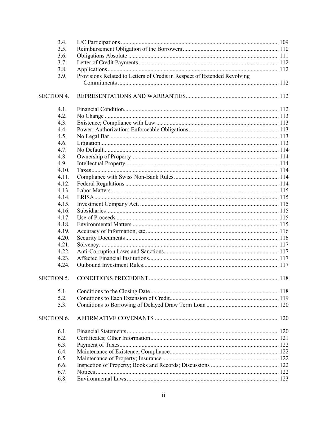 ii 3.4. L/C Participations ........................................................................................................... 109 3.5. Reimbursement Obligation of the Borrowers ................................................................. 110 3.6. Obligations Absolute ...................................................................................................... 111 3.7. Letter of Credit Payments ............................................................................................... 112 3.8. Applications .................................................................................................................... 112 3.9. Provisions Related to Letters of Credit in Respect of Extended Revolving Commitments ............................................................................................................. 112 SECTION 4. REPRESENTATIONS AND WARRANTIES ............................................................... 112 4.1. Financial Condition ......................................................................................................... 112 4.2. No Change ...................................................................................................................... 113 4.3. Existence; Compliance with Law ................................................................................... 113 4.4. Power; Authorization; Enforceable Obligations ............................................................. 113 4.5. No Legal Bar ................................................................................................................... 113 4.6. Litigation ......................................................................................................................... 113 4.7. No Default....................................................................................................................... 114 4.8. Ownership of Property .................................................................................................... 114 4.9. Intellectual Property ........................................................................................................ 114 4.10. Taxes ............................................................................................................................... 114 4.11. Compliance with Swiss Non-Bank Rules ....................................................................... 114 4.12. Federal Regulations ........................................................................................................ 114 4.13. Labor Matters .................................................................................................................. 115 4.14. ERISA ............................................................................................................................. 115 4.15. Investment Company Act. .............................................................................................. 115 4.16. Subsidiaries ..................................................................................................................... 115 4.17. Use of Proceeds .............................................................................................................. 115 4.18. Environmental Matters ................................................................................................... 115 4.19. Accuracy of Information, etc .......................................................................................... 116 4.20. Security Documents ........................................................................................................ 116 4.21. Solvency.......................................................................................................................... 117 4.22. Anti-Corruption Laws and Sanctions .............................................................................. 117 4.23. Affected Financial Institutions ........................................................................................ 117 4.24. Outbound Investment Rules ............................................................................................ 117 SECTION 5. CONDITIONS PRECEDENT ........................................................................................ 118 5.1. Conditions to the Closing Date ....................................................................................... 118 5.2. Conditions to Each Extension of Credit .......................................................................... 119 5.3. Conditions to Borrowing of Delayed Draw Term Loan ................................................. 120 SECTION 6. AFFIRMATIVE COVENANTS .................................................................................... 120 6.1. Financial Statements ....................................................................................................... 120 6.2. Certificates; Other Information ....................................................................................... 121 6.3. Payment of Taxes ............................................................................................................ 122 6.4. Maintenance of Existence; Compliance .......................................................................... 122 6.5. Maintenance of Property; Insurance ............................................................................... 122 6.6. Inspection of Property; Books and Records; Discussions .............................................. 122 6.7. Notices ............................................................................................................................ 122 6.8. Environmental Laws ....................................................................................................... 123