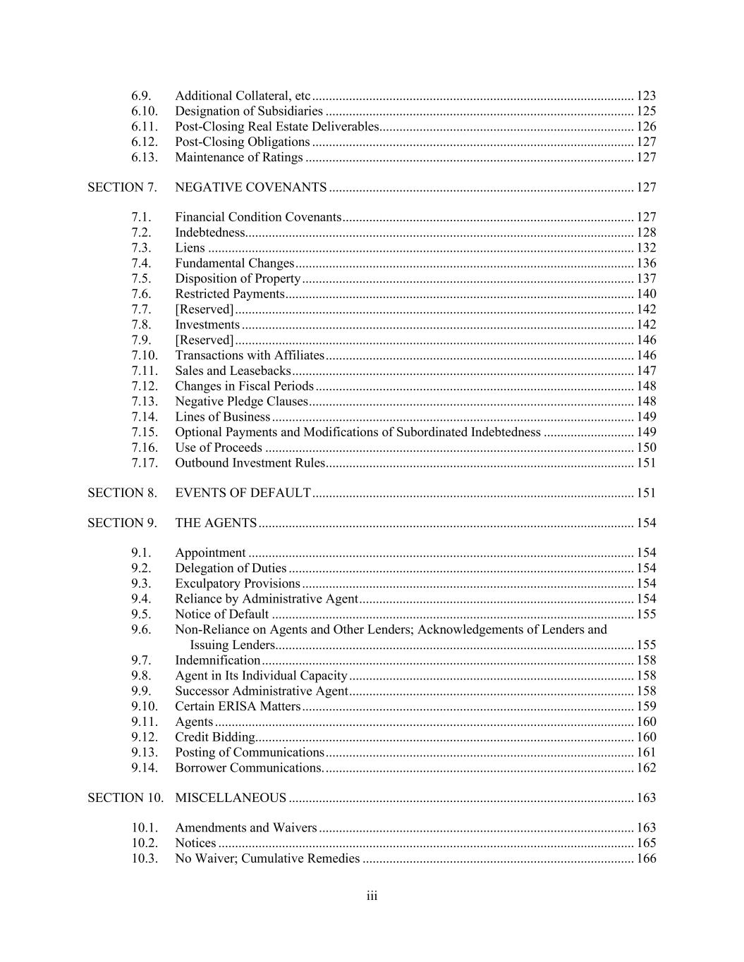 iii 6.9. Additional Collateral, etc ................................................................................................ 123 6.10. Designation of Subsidiaries ............................................................................................ 125 6.11. Post-Closing Real Estate Deliverables ............................................................................ 126 6.12. Post-Closing Obligations ................................................................................................ 127 6.13. Maintenance of Ratings .................................................................................................. 127 SECTION 7. NEGATIVE COVENANTS ........................................................................................... 127 7.1. Financial Condition Covenants ....................................................................................... 127 7.2. Indebtedness.................................................................................................................... 128 7.3. Liens ............................................................................................................................... 132 7.4. Fundamental Changes ..................................................................................................... 136 7.5. Disposition of Property ................................................................................................... 137 7.6. Restricted Payments ........................................................................................................ 140 7.7. [Reserved] ....................................................................................................................... 142 7.8. Investments ..................................................................................................................... 142 7.9. [Reserved] ....................................................................................................................... 146 7.10. Transactions with Affiliates ............................................................................................ 146 7.11. Sales and Leasebacks ...................................................................................................... 147 7.12. Changes in Fiscal Periods ............................................................................................... 148 7.13. Negative Pledge Clauses ................................................................................................. 148 7.14. Lines of Business ............................................................................................................ 149 7.15. Optional Payments and Modifications of Subordinated Indebtedness ........................... 149 7.16. Use of Proceeds .............................................................................................................. 150 7.17. Outbound Investment Rules ............................................................................................ 151 SECTION 8. EVENTS OF DEFAULT ................................................................................................ 151 SECTION 9. THE AGENTS ................................................................................................................ 154 9.1. Appointment ................................................................................................................... 154 9.2. Delegation of Duties ....................................................................................................... 154 9.3. Exculpatory Provisions ................................................................................................... 154 9.4. Reliance by Administrative Agent .................................................................................. 154 9.5. Notice of Default ............................................................................................................ 155 9.6. Non-Reliance on Agents and Other Lenders; Acknowledgements of Lenders and Issuing Lenders ........................................................................................................... 155 9.7. Indemnification ............................................................................................................... 158 9.8. Agent in Its Individual Capacity ..................................................................................... 158 9.9. Successor Administrative Agent ..................................................................................... 158 9.10. Certain ERISA Matters ................................................................................................... 159 9.11. Agents ............................................................................................................................. 160 9.12. Credit Bidding ................................................................................................................. 160 9.13. Posting of Communications ............................................................................................ 161 9.14. Borrower Communications. ............................................................................................ 162 SECTION 10. MISCELLANEOUS ....................................................................................................... 163 10.1. Amendments and Waivers .............................................................................................. 163 10.2. Notices ............................................................................................................................ 165 10.3. No Waiver; Cumulative Remedies ................................................................................. 166