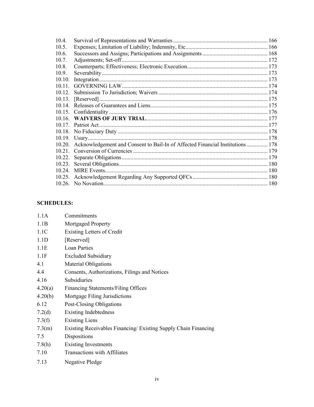 iv 10.4. Survival of Representations and Warranties ................................................................... 166 10.5. Expenses; Limitation of Liability; Indemnity, Etc. ......................................................... 166 10.6. Successors and Assigns; Participations and Assignments .............................................. 168 10.7. Adjustments; Set-off ....................................................................................................... 172 10.8. Counterparts; Effectiveness; Electronic Execution......................................................... 173 10.9. Severability ..................................................................................................................... 173 10.10. Integration ....................................................................................................................... 173 10.11. GOVERNING LAW ....................................................................................................... 174 10.12. Submission To Jurisdiction; Waivers ............................................................................. 174 10.13. [Reserved] ....................................................................................................................... 175 10.14. Releases of Guarantees and Liens................................................................................... 175 10.15. Confidentiality ................................................................................................................ 176 10.16. WAIVERS OF JURY TRIAL...................................................................................... 177 10.17. Patriot Act ....................................................................................................................... 177 10.18. No Fiduciary Duty .......................................................................................................... 178 10.19. Usury ............................................................................................................................... 178 10.20. Acknowledgement and Consent to Bail-In of Affected Financial Institutions ............... 178 10.21. Conversion of Currencies ............................................................................................... 179 10.22. Separate Obligations ....................................................................................................... 179 10.23. Several Obligations ......................................................................................................... 180 10.24. MIRE Events................................................................................................................... 180 10.25. Acknowledgement Regarding Any Supported QFCs ..................................................... 180 10.26. No Novation .................................................................................................................... 180 SCHEDULES: 1.1A Commitments 1.1B Mortgaged Property 1.1C Existing Letters of Credit 1.1D [Reserved] 1.1E Loan Parties 1.1F Excluded Subsidiary 4.1 Material Obligations 4.4 Consents, Authorizations, Filings and Notices 4.16 Subsidiaries 4.20(a) Financing Statements/Filing Offices 4.20(b) Mortgage Filing Jurisdictions 6.12 Post-Closing Obligations 7.2(d) Existing Indebtedness 7.3(f) Existing Liens 7.3(m) Existing Receivables Financing/ Existing Supply Chain Financing 7.5 Dispositions 7.8(h) Existing Investments 7.10 Transactions with Affiliates 7.13 Negative Pledge