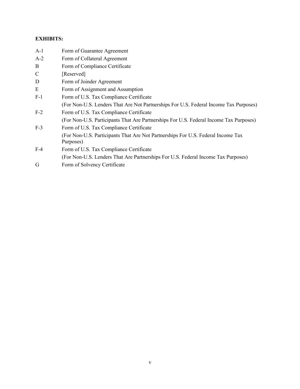 v EXHIBITS: A-1 Form of Guarantee Agreement A-2 Form of Collateral Agreement B Form of Compliance Certificate C [Reserved] D Form of Joinder Agreement E Form of Assignment and Assumption F-1 Form of U.S. Tax Compliance Certificate (For Non-U.S. Lenders That Are Not Partnerships For U.S. Federal Income Tax Purposes) F-2 Form of U.S. Tax Compliance Certificate (For Non-U.S. Participants That Are Partnerships For U.S. Federal Income Tax Purposes) F-3 Form of U.S. Tax Compliance Certificate (For Non-U.S. Participants That Are Not Partnerships For U.S. Federal Income Tax Purposes) F-4 Form of U.S. Tax Compliance Certificate (For Non-U.S. Lenders That Are Partnerships For U.S. Federal Income Tax Purposes) G Form of Solvency Certificate