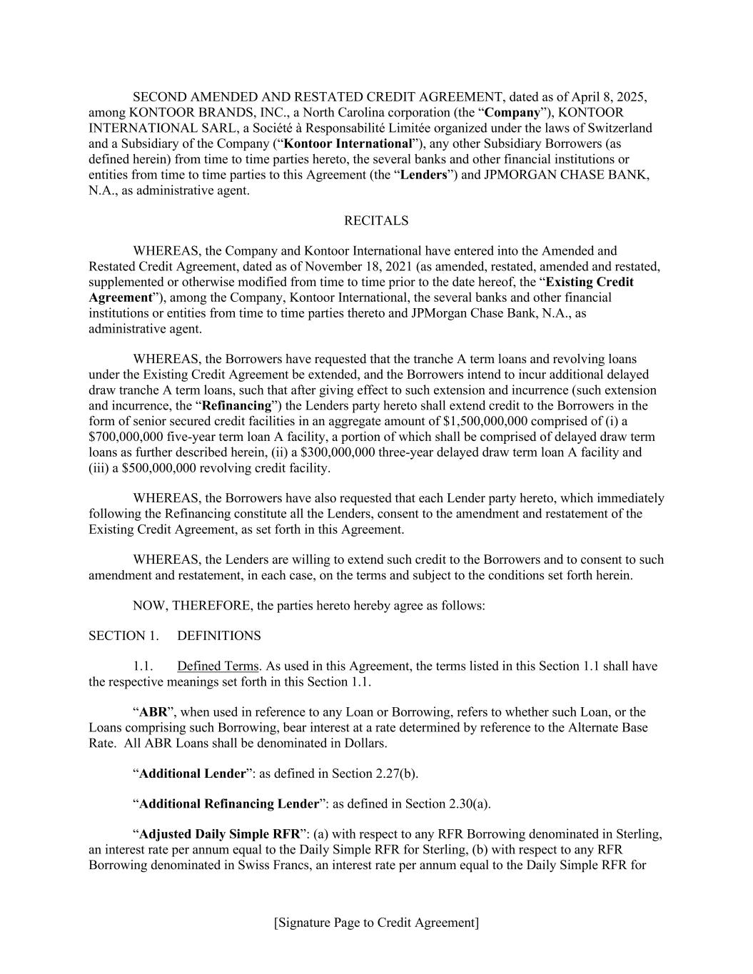 [Signature Page to Credit Agreement] SECOND AMENDED AND RESTATED CREDIT AGREEMENT, dated as of April 8, 2025, among KONTOOR BRANDS, INC., a North Carolina corporation (the “Company”), KONTOOR INTERNATIONAL SARL, a Société à Responsabilité Limitée organized under the laws of Switzerland and a Subsidiary of the Company (“Kontoor International”), any other Subsidiary Borrowers (as defined herein) from time to time parties hereto, the several banks and other financial institutions or entities from time to time parties to this Agreement (the “Lenders”) and JPMORGAN CHASE BANK, N.A., as administrative agent. RECITALS WHEREAS, the Company and Kontoor International have entered into the Amended and Restated Credit Agreement, dated as of November 18, 2021 (as amended, restated, amended and restated, supplemented or otherwise modified from time to time prior to the date hereof, the “Existing Credit Agreement”), among the Company, Kontoor International, the several banks and other financial institutions or entities from time to time parties thereto and JPMorgan Chase Bank, N.A., as administrative agent. WHEREAS, the Borrowers have requested that the tranche A term loans and revolving loans under the Existing Credit Agreement be extended, and the Borrowers intend to incur additional delayed draw tranche A term loans, such that after giving effect to such extension and incurrence (such extension and incurrence, the “Refinancing”) the Lenders party hereto shall extend credit to the Borrowers in the form of senior secured credit facilities in an aggregate amount of $1,500,000,000 comprised of (i) a $700,000,000 five-year term loan A facility, a portion of which shall be comprised of delayed draw term loans as further described herein, (ii) a $300,000,000 three-year delayed draw term loan A facility and (iii) a $500,000,000 revolving credit facility. WHEREAS, the Borrowers have also requested that each Lender party hereto, which immediately following the Refinancing constitute all the Lenders, consent to the amendment and restatement of the Existing Credit Agreement, as set forth in this Agreement. WHEREAS, the Lenders are willing to extend such credit to the Borrowers and to consent to such amendment and restatement, in each case, on the terms and subject to the conditions set forth herein. NOW, THEREFORE, the parties hereto hereby agree as follows: SECTION 1. DEFINITIONS 1.1. Defined Terms. As used in this Agreement, the terms listed in this Section 1.1 shall have the respective meanings set forth in this Section 1.1. “ABR”, when used in reference to any Loan or Borrowing, refers to whether such Loan, or the Loans comprising such Borrowing, bear interest at a rate determined by reference to the Alternate Base Rate. All ABR Loans shall be denominated in Dollars. “Additional Lender”: as defined in Section 2.27(b). “Additional Refinancing Lender”: as defined in Section 2.30(a). “Adjusted Daily Simple RFR”: (a) with respect to any RFR Borrowing denominated in Sterling, an interest rate per annum equal to the Daily Simple RFR for Sterling, (b) with respect to any RFR Borrowing denominated in Swiss Francs, an interest rate per annum equal to the Daily Simple RFR for