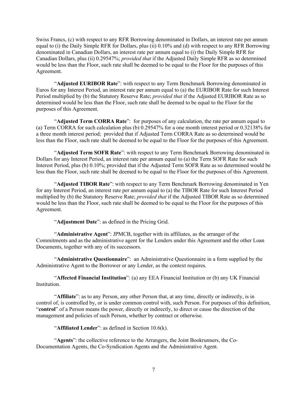 7 Swiss Francs, (c) with respect to any RFR Borrowing denominated in Dollars, an interest rate per annum equal to (i) the Daily Simple RFR for Dollars, plus (ii) 0.10% and (d) with respect to any RFR Borrowing denominated in Canadian Dollars, an interest rate per annum equal to (i) the Daily Simple RFR for Canadian Dollars, plus (ii) 0.29547%; provided that if the Adjusted Daily Simple RFR as so determined would be less than the Floor, such rate shall be deemed to be equal to the Floor for the purposes of this Agreement. “Adjusted EURIBOR Rate”: with respect to any Term Benchmark Borrowing denominated in Euros for any Interest Period, an interest rate per annum equal to (a) the EURIBOR Rate for such Interest Period multiplied by (b) the Statutory Reserve Rate; provided that if the Adjusted EURIBOR Rate as so determined would be less than the Floor, such rate shall be deemed to be equal to the Floor for the purposes of this Agreement. “Adjusted Term CORRA Rate”: for purposes of any calculation, the rate per annum equal to (a) Term CORRA for such calculation plus (b) 0.29547% for a one month interest period or 0.32138% for a three month interest period; provided that if Adjusted Term CORRA Rate as so determined would be less than the Floor, such rate shall be deemed to be equal to the Floor for the purposes of this Agreement. “Adjusted Term SOFR Rate”: with respect to any Term Benchmark Borrowing denominated in Dollars for any Interest Period, an interest rate per annum equal to (a) the Term SOFR Rate for such Interest Period, plus (b) 0.10%; provided that if the Adjusted Term SOFR Rate as so determined would be less than the Floor, such rate shall be deemed to be equal to the Floor for the purposes of this Agreement. “Adjusted TIBOR Rate”: with respect to any Term Benchmark Borrowing denominated in Yen for any Interest Period, an interest rate per annum equal to (a) the TIBOR Rate for such Interest Period multiplied by (b) the Statutory Reserve Rate; provided that if the Adjusted TIBOR Rate as so determined would be less than the Floor, such rate shall be deemed to be equal to the Floor for the purposes of this Agreement. “Adjustment Date”: as defined in the Pricing Grid. “Administrative Agent”: JPMCB, together with its affiliates, as the arranger of the Commitments and as the administrative agent for the Lenders under this Agreement and the other Loan Documents, together with any of its successors. “Administrative Questionnaire”: an Administrative Questionnaire in a form supplied by the Administrative Agent to the Borrower or any Lender, as the context requires. “Affected Financial Institution”: (a) any EEA Financial Institution or (b) any UK Financial Institution. “Affiliate”: as to any Person, any other Person that, at any time, directly or indirectly, is in control of, is controlled by, or is under common control with, such Person. For purposes of this definition, “control” of a Person means the power, directly or indirectly, to direct or cause the direction of the management and policies of such Person, whether by contract or otherwise. “Affiliated Lender”: as defined in Section 10.6(k). “Agents”: the collective reference to the Arrangers, the Joint Bookrunners, the Co- Documentation Agents, the Co-Syndication Agents and the Administrative Agent.