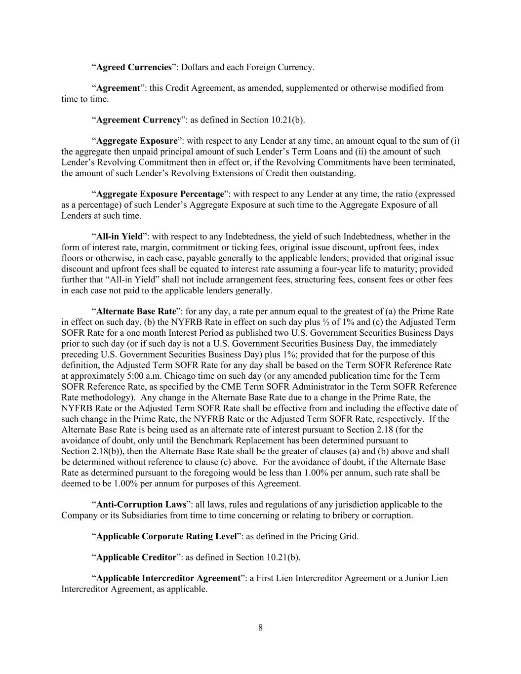 8 “Agreed Currencies”: Dollars and each Foreign Currency. “Agreement”: this Credit Agreement, as amended, supplemented or otherwise modified from time to time. “Agreement Currency”: as defined in Section 10.21(b). “Aggregate Exposure”: with respect to any Lender at any time, an amount equal to the sum of (i) the aggregate then unpaid principal amount of such Lender’s Term Loans and (ii) the amount of such Lender’s Revolving Commitment then in effect or, if the Revolving Commitments have been terminated, the amount of such Lender’s Revolving Extensions of Credit then outstanding. “Aggregate Exposure Percentage”: with respect to any Lender at any time, the ratio (expressed as a percentage) of such Lender’s Aggregate Exposure at such time to the Aggregate Exposure of all Lenders at such time. “All-in Yield”: with respect to any Indebtedness, the yield of such Indebtedness, whether in the form of interest rate, margin, commitment or ticking fees, original issue discount, upfront fees, index floors or otherwise, in each case, payable generally to the applicable lenders; provided that original issue discount and upfront fees shall be equated to interest rate assuming a four-year life to maturity; provided further that “All-in Yield” shall not include arrangement fees, structuring fees, consent fees or other fees in each case not paid to the applicable lenders generally. “Alternate Base Rate”: for any day, a rate per annum equal to the greatest of (a) the Prime Rate in effect on such day, (b) the NYFRB Rate in effect on such day plus ½ of 1% and (c) the Adjusted Term SOFR Rate for a one month Interest Period as published two U.S. Government Securities Business Days prior to such day (or if such day is not a U.S. Government Securities Business Day, the immediately preceding U.S. Government Securities Business Day) plus 1%; provided that for the purpose of this definition, the Adjusted Term SOFR Rate for any day shall be based on the Term SOFR Reference Rate at approximately 5:00 a.m. Chicago time on such day (or any amended publication time for the Term SOFR Reference Rate, as specified by the CME Term SOFR Administrator in the Term SOFR Reference Rate methodology). Any change in the Alternate Base Rate due to a change in the Prime Rate, the NYFRB Rate or the Adjusted Term SOFR Rate shall be effective from and including the effective date of such change in the Prime Rate, the NYFRB Rate or the Adjusted Term SOFR Rate, respectively. If the Alternate Base Rate is being used as an alternate rate of interest pursuant to Section 2.18 (for the avoidance of doubt, only until the Benchmark Replacement has been determined pursuant to Section 2.18(b)), then the Alternate Base Rate shall be the greater of clauses (a) and (b) above and shall be determined without reference to clause (c) above. For the avoidance of doubt, if the Alternate Base Rate as determined pursuant to the foregoing would be less than 1.00% per annum, such rate shall be deemed to be 1.00% per annum for purposes of this Agreement. “Anti-Corruption Laws”: all laws, rules and regulations of any jurisdiction applicable to the Company or its Subsidiaries from time to time concerning or relating to bribery or corruption. “Applicable Corporate Rating Level”: as defined in the Pricing Grid. “Applicable Creditor”: as defined in Section 10.21(b). “Applicable Intercreditor Agreement”: a First Lien Intercreditor Agreement or a Junior Lien Intercreditor Agreement, as applicable.