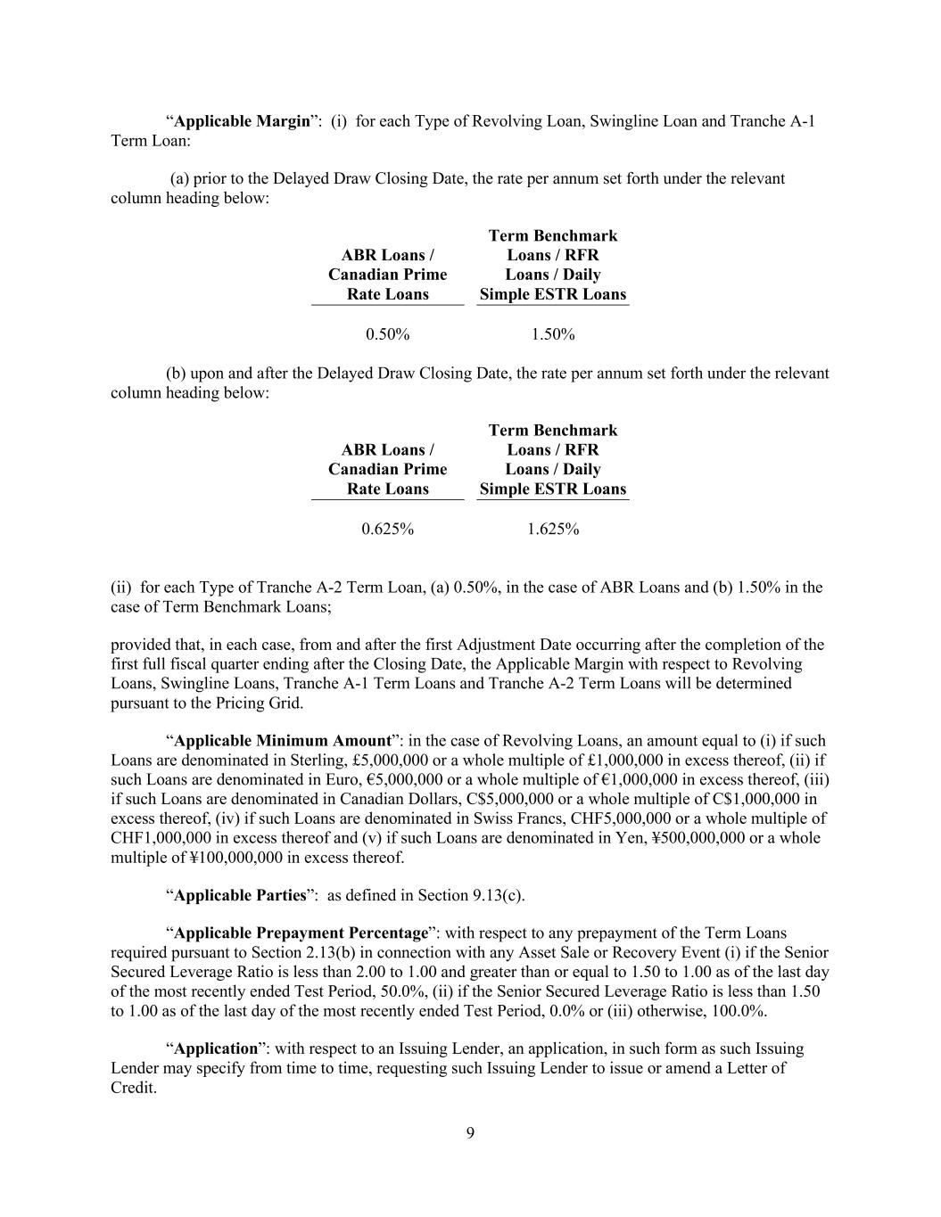 9 “Applicable Margin”: (i) for each Type of Revolving Loan, Swingline Loan and Tranche A-1 Term Loan: (a) prior to the Delayed Draw Closing Date, the rate per annum set forth under the relevant column heading below: ABR Loans / Canadian Prime Rate Loans Term Benchmark Loans / RFR Loans / Daily Simple ESTR Loans 0.50% 1.50% (b) upon and after the Delayed Draw Closing Date, the rate per annum set forth under the relevant column heading below: ABR Loans / Canadian Prime Rate Loans Term Benchmark Loans / RFR Loans / Daily Simple ESTR Loans 0.625% 1.625% (ii) for each Type of Tranche A-2 Term Loan, (a) 0.50%, in the case of ABR Loans and (b) 1.50% in the case of Term Benchmark Loans; provided that, in each case, from and after the first Adjustment Date occurring after the completion of the first full fiscal quarter ending after the Closing Date, the Applicable Margin with respect to Revolving Loans, Swingline Loans, Tranche A-1 Term Loans and Tranche A-2 Term Loans will be determined pursuant to the Pricing Grid. “Applicable Minimum Amount”: in the case of Revolving Loans, an amount equal to (i) if such Loans are denominated in Sterling, £5,000,000 or a whole multiple of £1,000,000 in excess thereof, (ii) if such Loans are denominated in Euro, €5,000,000 or a whole multiple of €1,000,000 in excess thereof, (iii) if such Loans are denominated in Canadian Dollars, C$5,000,000 or a whole multiple of C$1,000,000 in excess thereof, (iv) if such Loans are denominated in Swiss Francs, CHF5,000,000 or a whole multiple of CHF1,000,000 in excess thereof and (v) if such Loans are denominated in Yen, ¥500,000,000 or a whole multiple of ¥100,000,000 in excess thereof. “Applicable Parties”: as defined in Section 9.13(c). “Applicable Prepayment Percentage”: with respect to any prepayment of the Term Loans required pursuant to Section 2.13(b) in connection with any Asset Sale or Recovery Event (i) if the Senior Secured Leverage Ratio is less than 2.00 to 1.00 and greater than or equal to 1.50 to 1.00 as of the last day of the most recently ended Test Period, 50.0%, (ii) if the Senior Secured Leverage Ratio is less than 1.50 to 1.00 as of the last day of the most recently ended Test Period, 0.0% or (iii) otherwise, 100.0%. “Application”: with respect to an Issuing Lender, an application, in such form as such Issuing Lender may specify from time to time, requesting such Issuing Lender to issue or amend a Letter of Credit.