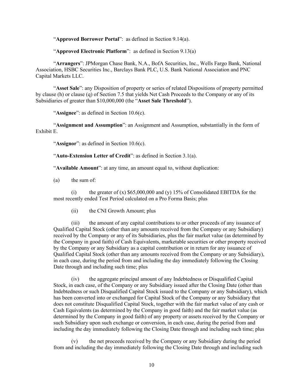 10 “Approved Borrower Portal”: as defined in Section 9.14(a). “Approved Electronic Platform”: as defined in Section 9.13(a) “Arrangers”: JPMorgan Chase Bank, N.A., BofA Securities, Inc., Wells Fargo Bank, National Association, HSBC Securities Inc., Barclays Bank PLC, U.S. Bank National Association and PNC Capital Markets LLC. “Asset Sale”: any Disposition of property or series of related Dispositions of property permitted by clause (h) or clause (q) of Section 7.5 that yields Net Cash Proceeds to the Company or any of its Subsidiaries of greater than $10,000,000 (the “Asset Sale Threshold”). “Assignee”: as defined in Section 10.6(c). “Assignment and Assumption”: an Assignment and Assumption, substantially in the form of Exhibit E. “Assignor”: as defined in Section 10.6(c). “Auto-Extension Letter of Credit”: as defined in Section 3.1(a). “Available Amount”: at any time, an amount equal to, without duplication: (a) the sum of: (i) the greater of (x) $65,000,000 and (y) 15% of Consolidated EBITDA for the most recently ended Test Period calculated on a Pro Forma Basis; plus (ii) the CNI Growth Amount; plus (iii) the amount of any capital contributions to or other proceeds of any issuance of Qualified Capital Stock (other than any amounts received from the Company or any Subsidiary) received by the Company or any of its Subsidiaries, plus the fair market value (as determined by the Company in good faith) of Cash Equivalents, marketable securities or other property received by the Company or any Subsidiary as a capital contribution or in return for any issuance of Qualified Capital Stock (other than any amounts received from the Company or any Subsidiary), in each case, during the period from and including the day immediately following the Closing Date through and including such time; plus (iv) the aggregate principal amount of any Indebtedness or Disqualified Capital Stock, in each case, of the Company or any Subsidiary issued after the Closing Date (other than Indebtedness or such Disqualified Capital Stock issued to the Company or any Subsidiary), which has been converted into or exchanged for Capital Stock of the Company or any Subsidiary that does not constitute Disqualified Capital Stock, together with the fair market value of any cash or Cash Equivalents (as determined by the Company in good faith) and the fair market value (as determined by the Company in good faith) of any property or assets received by the Company or such Subsidiary upon such exchange or conversion, in each case, during the period from and including the day immediately following the Closing Date through and including such time; plus (v) the net proceeds received by the Company or any Subsidiary during the period from and including the day immediately following the Closing Date through and including such
