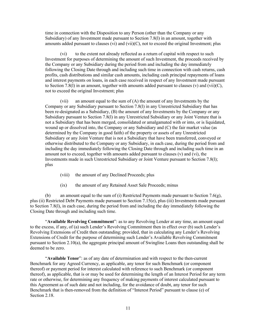 11 time in connection with the Disposition to any Person (other than the Company or any Subsidiary) of any Investment made pursuant to Section 7.8(l) in an amount, together with amounts added pursuant to clauses (vi) and (vii)(C), not to exceed the original Investment; plus (vi) to the extent not already reflected as a return of capital with respect to such Investment for purposes of determining the amount of such Investment, the proceeds received by the Company or any Subsidiary during the period from and including the day immediately following the Closing Date through and including such time in connection with cash returns, cash profits, cash distributions and similar cash amounts, including cash principal repayments of loans and interest payments on loans, in each case received in respect of any Investment made pursuant to Section 7.8(l) in an amount, together with amounts added pursuant to clauses (v) and (vii)(C), not to exceed the original Investment; plus (vii) an amount equal to the sum of (A) the amount of any Investments by the Company or any Subsidiary pursuant to Section 7.8(l) in any Unrestricted Subsidiary that has been re-designated as a Subsidiary, (B) the amount of any Investments by the Company or any Subsidiary pursuant to Section 7.8(l) in any Unrestricted Subsidiary or any Joint Venture that is not a Subsidiary that has been merged, consolidated or amalgamated with or into, or is liquidated, wound up or dissolved into, the Company or any Subsidiary and (C) the fair market value (as determined by the Company in good faith) of the property or assets of any Unrestricted Subsidiary or any Joint Venture that is not a Subsidiary that have been transferred, conveyed or otherwise distributed to the Company or any Subsidiary, in each case, during the period from and including the day immediately following the Closing Date through and including such time in an amount not to exceed, together with amounts added pursuant to clauses (v) and (vi), the Investments made in such Unrestricted Subsidiary or Joint Venture pursuant to Section 7.8(l); plus (viii) the amount of any Declined Proceeds; plus (ix) the amount of any Retained Asset Sale Proceeds; minus (b) an amount equal to the sum of (i) Restricted Payments made pursuant to Section 7.6(g), plus (ii) Restricted Debt Payments made pursuant to Section 7.15(e), plus (iii) Investments made pursuant to Section 7.8(l), in each case, during the period from and including the day immediately following the Closing Date through and including such time. “Available Revolving Commitment”: as to any Revolving Lender at any time, an amount equal to the excess, if any, of (a) such Lender’s Revolving Commitment then in effect over (b) such Lender’s Revolving Extensions of Credit then outstanding; provided, that in calculating any Lender’s Revolving Extensions of Credit for the purpose of determining such Lender’s Available Revolving Commitment pursuant to Section 2.10(a), the aggregate principal amount of Swingline Loans then outstanding shall be deemed to be zero. “Available Tenor”: as of any date of determination and with respect to the then-current Benchmark for any Agreed Currency, as applicable, any tenor for such Benchmark (or component thereof) or payment period for interest calculated with reference to such Benchmark (or component thereof), as applicable, that is or may be used for determining the length of an Interest Period for any term rate or otherwise, for determining any frequency of making payments of interest calculated pursuant to this Agreement as of such date and not including, for the avoidance of doubt, any tenor for such Benchmark that is then-removed from the definition of “Interest Period” pursuant to clause (e) of Section 2.18.