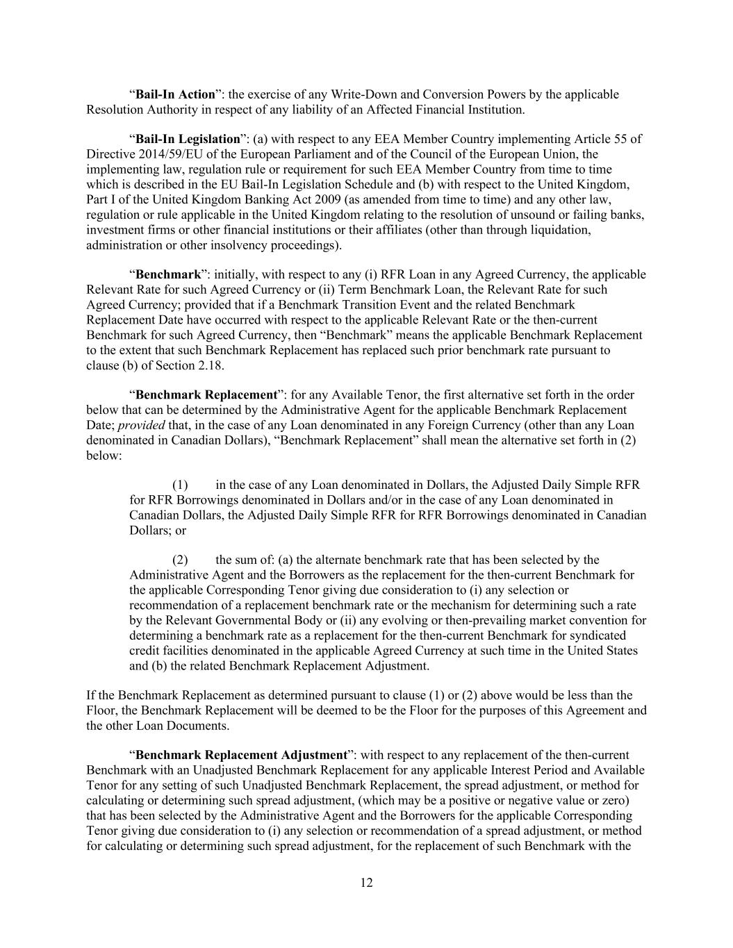 12 “Bail-In Action”: the exercise of any Write-Down and Conversion Powers by the applicable Resolution Authority in respect of any liability of an Affected Financial Institution. “Bail-In Legislation”: (a) with respect to any EEA Member Country implementing Article 55 of Directive 2014/59/EU of the European Parliament and of the Council of the European Union, the implementing law, regulation rule or requirement for such EEA Member Country from time to time which is described in the EU Bail-In Legislation Schedule and (b) with respect to the United Kingdom, Part I of the United Kingdom Banking Act 2009 (as amended from time to time) and any other law, regulation or rule applicable in the United Kingdom relating to the resolution of unsound or failing banks, investment firms or other financial institutions or their affiliates (other than through liquidation, administration or other insolvency proceedings). “Benchmark”: initially, with respect to any (i) RFR Loan in any Agreed Currency, the applicable Relevant Rate for such Agreed Currency or (ii) Term Benchmark Loan, the Relevant Rate for such Agreed Currency; provided that if a Benchmark Transition Event and the related Benchmark Replacement Date have occurred with respect to the applicable Relevant Rate or the then-current Benchmark for such Agreed Currency, then “Benchmark” means the applicable Benchmark Replacement to the extent that such Benchmark Replacement has replaced such prior benchmark rate pursuant to clause (b) of Section 2.18. “Benchmark Replacement”: for any Available Tenor, the first alternative set forth in the order below that can be determined by the Administrative Agent for the applicable Benchmark Replacement Date; provided that, in the case of any Loan denominated in any Foreign Currency (other than any Loan denominated in Canadian Dollars), “Benchmark Replacement” shall mean the alternative set forth in (2) below: (1) in the case of any Loan denominated in Dollars, the Adjusted Daily Simple RFR for RFR Borrowings denominated in Dollars and/or in the case of any Loan denominated in Canadian Dollars, the Adjusted Daily Simple RFR for RFR Borrowings denominated in Canadian Dollars; or (2) the sum of: (a) the alternate benchmark rate that has been selected by the Administrative Agent and the Borrowers as the replacement for the then-current Benchmark for the applicable Corresponding Tenor giving due consideration to (i) any selection or recommendation of a replacement benchmark rate or the mechanism for determining such a rate by the Relevant Governmental Body or (ii) any evolving or then-prevailing market convention for determining a benchmark rate as a replacement for the then-current Benchmark for syndicated credit facilities denominated in the applicable Agreed Currency at such time in the United States and (b) the related Benchmark Replacement Adjustment. If the Benchmark Replacement as determined pursuant to clause (1) or (2) above would be less than the Floor, the Benchmark Replacement will be deemed to be the Floor for the purposes of this Agreement and the other Loan Documents. “Benchmark Replacement Adjustment”: with respect to any replacement of the then-current Benchmark with an Unadjusted Benchmark Replacement for any applicable Interest Period and Available Tenor for any setting of such Unadjusted Benchmark Replacement, the spread adjustment, or method for calculating or determining such spread adjustment, (which may be a positive or negative value or zero) that has been selected by the Administrative Agent and the Borrowers for the applicable Corresponding Tenor giving due consideration to (i) any selection or recommendation of a spread adjustment, or method for calculating or determining such spread adjustment, for the replacement of such Benchmark with the