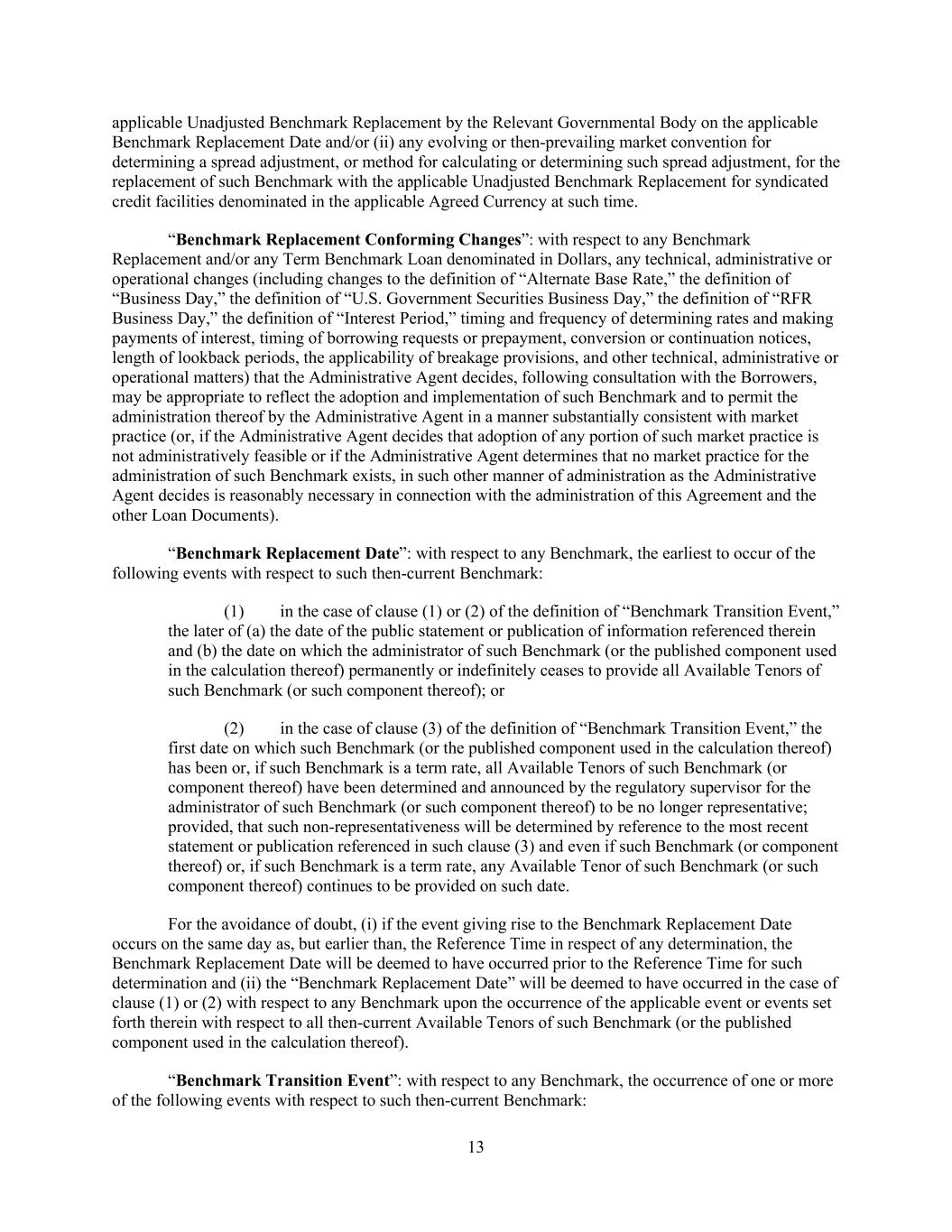 13 applicable Unadjusted Benchmark Replacement by the Relevant Governmental Body on the applicable Benchmark Replacement Date and/or (ii) any evolving or then-prevailing market convention for determining a spread adjustment, or method for calculating or determining such spread adjustment, for the replacement of such Benchmark with the applicable Unadjusted Benchmark Replacement for syndicated credit facilities denominated in the applicable Agreed Currency at such time. “Benchmark Replacement Conforming Changes”: with respect to any Benchmark Replacement and/or any Term Benchmark Loan denominated in Dollars, any technical, administrative or operational changes (including changes to the definition of “Alternate Base Rate,” the definition of “Business Day,” the definition of “U.S. Government Securities Business Day,” the definition of “RFR Business Day,” the definition of “Interest Period,” timing and frequency of determining rates and making payments of interest, timing of borrowing requests or prepayment, conversion or continuation notices, length of lookback periods, the applicability of breakage provisions, and other technical, administrative or operational matters) that the Administrative Agent decides, following consultation with the Borrowers, may be appropriate to reflect the adoption and implementation of such Benchmark and to permit the administration thereof by the Administrative Agent in a manner substantially consistent with market practice (or, if the Administrative Agent decides that adoption of any portion of such market practice is not administratively feasible or if the Administrative Agent determines that no market practice for the administration of such Benchmark exists, in such other manner of administration as the Administrative Agent decides is reasonably necessary in connection with the administration of this Agreement and the other Loan Documents). “Benchmark Replacement Date”: with respect to any Benchmark, the earliest to occur of the following events with respect to such then-current Benchmark: (1) in the case of clause (1) or (2) of the definition of “Benchmark Transition Event,” the later of (a) the date of the public statement or publication of information referenced therein and (b) the date on which the administrator of such Benchmark (or the published component used in the calculation thereof) permanently or indefinitely ceases to provide all Available Tenors of such Benchmark (or such component thereof); or (2) in the case of clause (3) of the definition of “Benchmark Transition Event,” the first date on which such Benchmark (or the published component used in the calculation thereof) has been or, if such Benchmark is a term rate, all Available Tenors of such Benchmark (or component thereof) have been determined and announced by the regulatory supervisor for the administrator of such Benchmark (or such component thereof) to be no longer representative; provided, that such non-representativeness will be determined by reference to the most recent statement or publication referenced in such clause (3) and even if such Benchmark (or component thereof) or, if such Benchmark is a term rate, any Available Tenor of such Benchmark (or such component thereof) continues to be provided on such date. For the avoidance of doubt, (i) if the event giving rise to the Benchmark Replacement Date occurs on the same day as, but earlier than, the Reference Time in respect of any determination, the Benchmark Replacement Date will be deemed to have occurred prior to the Reference Time for such determination and (ii) the “Benchmark Replacement Date” will be deemed to have occurred in the case of clause (1) or (2) with respect to any Benchmark upon the occurrence of the applicable event or events set forth therein with respect to all then-current Available Tenors of such Benchmark (or the published component used in the calculation thereof). “Benchmark Transition Event”: with respect to any Benchmark, the occurrence of one or more of the following events with respect to such then-current Benchmark: