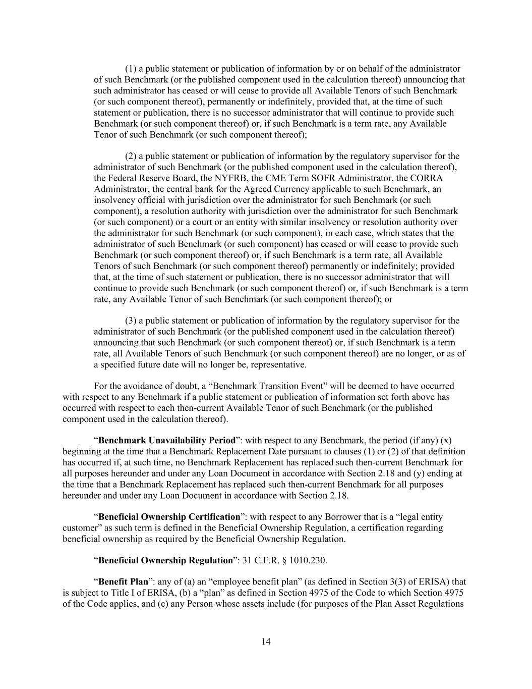 14 (1) a public statement or publication of information by or on behalf of the administrator of such Benchmark (or the published component used in the calculation thereof) announcing that such administrator has ceased or will cease to provide all Available Tenors of such Benchmark (or such component thereof), permanently or indefinitely, provided that, at the time of such statement or publication, there is no successor administrator that will continue to provide such Benchmark (or such component thereof) or, if such Benchmark is a term rate, any Available Tenor of such Benchmark (or such component thereof); (2) a public statement or publication of information by the regulatory supervisor for the administrator of such Benchmark (or the published component used in the calculation thereof), the Federal Reserve Board, the NYFRB, the CME Term SOFR Administrator, the CORRA Administrator, the central bank for the Agreed Currency applicable to such Benchmark, an insolvency official with jurisdiction over the administrator for such Benchmark (or such component), a resolution authority with jurisdiction over the administrator for such Benchmark (or such component) or a court or an entity with similar insolvency or resolution authority over the administrator for such Benchmark (or such component), in each case, which states that the administrator of such Benchmark (or such component) has ceased or will cease to provide such Benchmark (or such component thereof) or, if such Benchmark is a term rate, all Available Tenors of such Benchmark (or such component thereof) permanently or indefinitely; provided that, at the time of such statement or publication, there is no successor administrator that will continue to provide such Benchmark (or such component thereof) or, if such Benchmark is a term rate, any Available Tenor of such Benchmark (or such component thereof); or (3) a public statement or publication of information by the regulatory supervisor for the administrator of such Benchmark (or the published component used in the calculation thereof) announcing that such Benchmark (or such component thereof) or, if such Benchmark is a term rate, all Available Tenors of such Benchmark (or such component thereof) are no longer, or as of a specified future date will no longer be, representative. For the avoidance of doubt, a “Benchmark Transition Event” will be deemed to have occurred with respect to any Benchmark if a public statement or publication of information set forth above has occurred with respect to each then-current Available Tenor of such Benchmark (or the published component used in the calculation thereof). “Benchmark Unavailability Period”: with respect to any Benchmark, the period (if any) (x) beginning at the time that a Benchmark Replacement Date pursuant to clauses (1) or (2) of that definition has occurred if, at such time, no Benchmark Replacement has replaced such then-current Benchmark for all purposes hereunder and under any Loan Document in accordance with Section 2.18 and (y) ending at the time that a Benchmark Replacement has replaced such then-current Benchmark for all purposes hereunder and under any Loan Document in accordance with Section 2.18. “Beneficial Ownership Certification”: with respect to any Borrower that is a “legal entity customer” as such term is defined in the Beneficial Ownership Regulation, a certification regarding beneficial ownership as required by the Beneficial Ownership Regulation. “Beneficial Ownership Regulation”: 31 C.F.R. § 1010.230. “Benefit Plan”: any of (a) an “employee benefit plan” (as defined in Section 3(3) of ERISA) that is subject to Title I of ERISA, (b) a “plan” as defined in Section 4975 of the Code to which Section 4975 of the Code applies, and (c) any Person whose assets include (for purposes of the Plan Asset Regulations