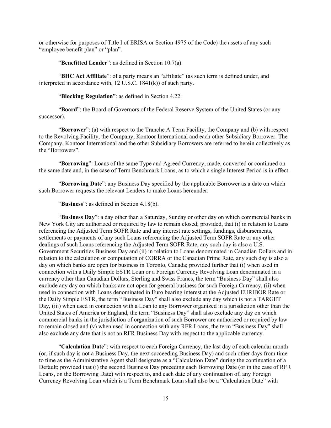 15 or otherwise for purposes of Title I of ERISA or Section 4975 of the Code) the assets of any such “employee benefit plan” or “plan”. “Benefitted Lender”: as defined in Section 10.7(a). “BHC Act Affiliate”: of a party means an “affiliate” (as such term is defined under, and interpreted in accordance with, 12 U.S.C. 1841(k)) of such party. “Blocking Regulation”: as defined in Section 4.22. “Board”: the Board of Governors of the Federal Reserve System of the United States (or any successor). “Borrower”: (a) with respect to the Tranche A Term Facility, the Company and (b) with respect to the Revolving Facility, the Company, Kontoor International and each other Subsidiary Borrower. The Company, Kontoor International and the other Subsidiary Borrowers are referred to herein collectively as the “Borrowers”. “Borrowing”: Loans of the same Type and Agreed Currency, made, converted or continued on the same date and, in the case of Term Benchmark Loans, as to which a single Interest Period is in effect. “Borrowing Date”: any Business Day specified by the applicable Borrower as a date on which such Borrower requests the relevant Lenders to make Loans hereunder. “Business”: as defined in Section 4.18(b). “Business Day”: a day other than a Saturday, Sunday or other day on which commercial banks in New York City are authorized or required by law to remain closed; provided, that (i) in relation to Loans referencing the Adjusted Term SOFR Rate and any interest rate settings, fundings, disbursements, settlements or payments of any such Loans referencing the Adjusted Term SOFR Rate or any other dealings of such Loans referencing the Adjusted Term SOFR Rate, any such day is also a U.S. Government Securities Business Day and (ii) in relation to Loans denominated in Canadian Dollars and in relation to the calculation or computation of CORRA or the Canadian Prime Rate, any such day is also a day on which banks are open for business in Toronto, Canada; provided further that (i) when used in connection with a Daily Simple ESTR Loan or a Foreign Currency Revolving Loan denominated in a currency other than Canadian Dollars, Sterling and Swiss Francs, the term “Business Day” shall also exclude any day on which banks are not open for general business for such Foreign Currency, (ii) when used in connection with Loans denominated in Euro bearing interest at the Adjusted EURIBOR Rate or the Daily Simple ESTR, the term “Business Day” shall also exclude any day which is not a TARGET Day, (iii) when used in connection with a Loan to any Borrower organized in a jurisdiction other than the United States of America or England, the term “Business Day” shall also exclude any day on which commercial banks in the jurisdiction of organization of such Borrower are authorized or required by law to remain closed and (v) when used in connection with any RFR Loans, the term “Business Day” shall also exclude any date that is not an RFR Business Day with respect to the applicable currency. “Calculation Date”: with respect to each Foreign Currency, the last day of each calendar month (or, if such day is not a Business Day, the next succeeding Business Day) and such other days from time to time as the Administrative Agent shall designate as a “Calculation Date” during the continuation of a Default; provided that (i) the second Business Day preceding each Borrowing Date (or in the case of RFR Loans, on the Borrowing Date) with respect to, and each date of any continuation of, any Foreign Currency Revolving Loan which is a Term Benchmark Loan shall also be a “Calculation Date” with