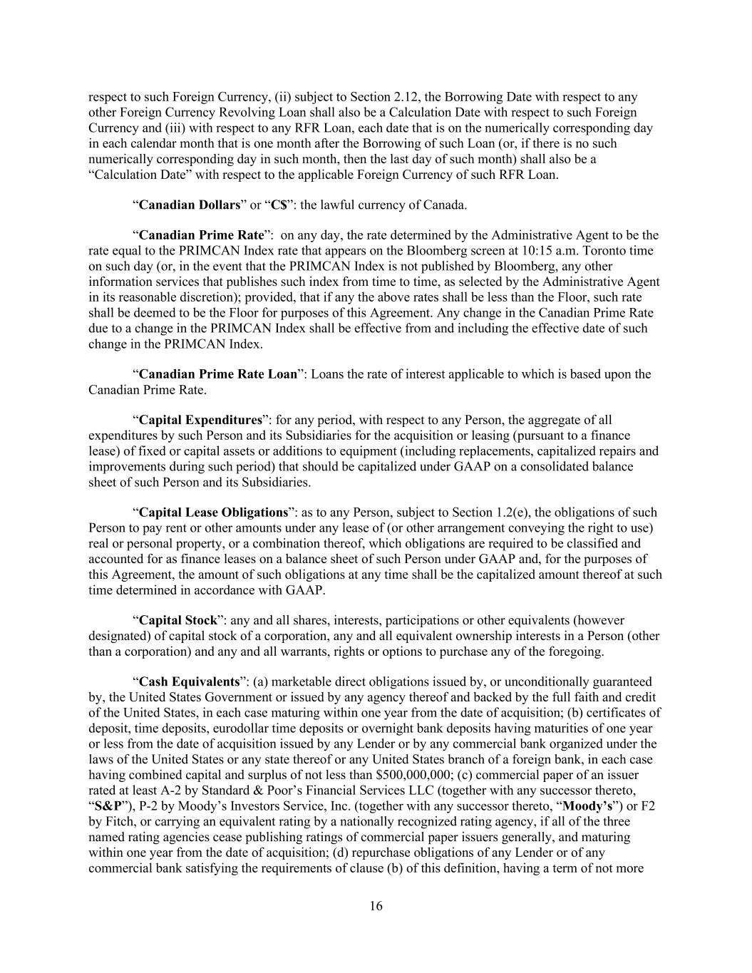 16 respect to such Foreign Currency, (ii) subject to Section 2.12, the Borrowing Date with respect to any other Foreign Currency Revolving Loan shall also be a Calculation Date with respect to such Foreign Currency and (iii) with respect to any RFR Loan, each date that is on the numerically corresponding day in each calendar month that is one month after the Borrowing of such Loan (or, if there is no such numerically corresponding day in such month, then the last day of such month) shall also be a “Calculation Date” with respect to the applicable Foreign Currency of such RFR Loan. “Canadian Dollars” or “C$”: the lawful currency of Canada. “Canadian Prime Rate”: on any day, the rate determined by the Administrative Agent to be the rate equal to the PRIMCAN Index rate that appears on the Bloomberg screen at 10:15 a.m. Toronto time on such day (or, in the event that the PRIMCAN Index is not published by Bloomberg, any other information services that publishes such index from time to time, as selected by the Administrative Agent in its reasonable discretion); provided, that if any the above rates shall be less than the Floor, such rate shall be deemed to be the Floor for purposes of this Agreement. Any change in the Canadian Prime Rate due to a change in the PRIMCAN Index shall be effective from and including the effective date of such change in the PRIMCAN Index. “Canadian Prime Rate Loan”: Loans the rate of interest applicable to which is based upon the Canadian Prime Rate. “Capital Expenditures”: for any period, with respect to any Person, the aggregate of all expenditures by such Person and its Subsidiaries for the acquisition or leasing (pursuant to a finance lease) of fixed or capital assets or additions to equipment (including replacements, capitalized repairs and improvements during such period) that should be capitalized under GAAP on a consolidated balance sheet of such Person and its Subsidiaries. “Capital Lease Obligations”: as to any Person, subject to Section 1.2(e), the obligations of such Person to pay rent or other amounts under any lease of (or other arrangement conveying the right to use) real or personal property, or a combination thereof, which obligations are required to be classified and accounted for as finance leases on a balance sheet of such Person under GAAP and, for the purposes of this Agreement, the amount of such obligations at any time shall be the capitalized amount thereof at such time determined in accordance with GAAP. “Capital Stock”: any and all shares, interests, participations or other equivalents (however designated) of capital stock of a corporation, any and all equivalent ownership interests in a Person (other than a corporation) and any and all warrants, rights or options to purchase any of the foregoing. “Cash Equivalents”: (a) marketable direct obligations issued by, or unconditionally guaranteed by, the United States Government or issued by any agency thereof and backed by the full faith and credit of the United States, in each case maturing within one year from the date of acquisition; (b) certificates of deposit, time deposits, eurodollar time deposits or overnight bank deposits having maturities of one year or less from the date of acquisition issued by any Lender or by any commercial bank organized under the laws of the United States or any state thereof or any United States branch of a foreign bank, in each case having combined capital and surplus of not less than $500,000,000; (c) commercial paper of an issuer rated at least A-2 by Standard & Poor’s Financial Services LLC (together with any successor thereto, “S&P”), P-2 by Moody’s Investors Service, Inc. (together with any successor thereto, “Moody’s”) or F2 by Fitch, or carrying an equivalent rating by a nationally recognized rating agency, if all of the three named rating agencies cease publishing ratings of commercial paper issuers generally, and maturing within one year from the date of acquisition; (d) repurchase obligations of any Lender or of any commercial bank satisfying the requirements of clause (b) of this definition, having a term of not more