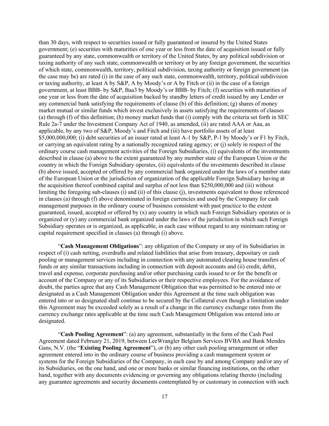 17 than 30 days, with respect to securities issued or fully guaranteed or insured by the United States government; (e) securities with maturities of one year or less from the date of acquisition issued or fully guaranteed by any state, commonwealth or territory of the United States, by any political subdivision or taxing authority of any such state, commonwealth or territory or by any foreign government, the securities of which state, commonwealth, territory, political subdivision, taxing authority or foreign government (as the case may be) are rated (i) in the case of any such state, commonwealth, territory, political subdivision or taxing authority, at least A by S&P, A by Moody’s or A by Fitch or (ii) in the case of a foreign government, at least BBB- by S&P, Baa3 by Moody’s or BBB- by Fitch; (f) securities with maturities of one year or less from the date of acquisition backed by standby letters of credit issued by any Lender or any commercial bank satisfying the requirements of clause (b) of this definition; (g) shares of money market mutual or similar funds which invest exclusively in assets satisfying the requirements of clauses (a) through (f) of this definition; (h) money market funds that (i) comply with the criteria set forth in SEC Rule 2a-7 under the Investment Company Act of 1940, as amended, (ii) are rated AAA or Aaa, as applicable, by any two of S&P, Moody’s and Fitch and (iii) have portfolio assets of at least $5,000,000,000; (i) debt securities of an issuer rated at least A-1 by S&P, P-1 by Moody’s or F1 by Fitch, or carrying an equivalent rating by a nationally recognized rating agency; or (j) solely in respect of the ordinary course cash management activities of the Foreign Subsidiaries, (i) equivalents of the investments described in clause (a) above to the extent guaranteed by any member state of the European Union or the country in which the Foreign Subsidiary operates, (ii) equivalents of the investments described in clause (b) above issued, accepted or offered by any commercial bank organized under the laws of a member state of the European Union or the jurisdiction of organization of the applicable Foreign Subsidiary having at the acquisition thereof combined capital and surplus of not less than $250,000,000 and (iii) without limiting the foregoing sub-clauses (i) and (ii) of this clause (j), investments equivalent to those referenced in clauses (a) through (f) above denominated in foreign currencies and used by the Company for cash management purposes in the ordinary course of business consistent with past practice to the extent guaranteed, issued, accepted or offered by (x) any country in which such Foreign Subsidiary operates or is organized or (y) any commercial bank organized under the laws of the jurisdiction in which such Foreign Subsidiary operates or is organized, as applicable, in each case without regard to any minimum rating or capital requirement specified in clauses (a) through (i) above. “Cash Management Obligations”: any obligation of the Company or any of its Subsidiaries in respect of (i) cash netting, overdrafts and related liabilities that arise from treasury, depositary or cash pooling or management services including in connection with any automated clearing house transfers of funds or any similar transactions including in connection with deposit accounts and (ii) credit, debit, travel and expense, corporate purchasing and/or other purchasing cards issued to or for the benefit or account of the Company or any of its Subsidiaries or their respective employees. For the avoidance of doubt, the parties agree that any Cash Management Obligation that was permitted to be entered into or designated as a Cash Management Obligation under this Agreement at the time such obligation was entered into or so designated shall continue to be secured by the Collateral even though a limitation under this Agreement may be exceeded solely as a result of a change in the currency exchange rates from the currency exchange rates applicable at the time such Cash Management Obligation was entered into or designated. “Cash Pooling Agreement”: (a) any agreement, substantially in the form of the Cash Pool Agreement dated February 21, 2019, between LeeWrangler Belgium Services BVBA and Bank Mendes Gans, N.V. (the “Existing Pooling Agreement”), or (b) any other cash pooling arrangement or other agreement entered into in the ordinary course of business providing a cash management system or systems for the Foreign Subsidiaries of the Company, in each case by and among Company and/or any of its Subsidiaries, on the one hand, and one or more banks or similar financing institutions, on the other hand, together with any documents evidencing or governing any obligations relating thereto (including any guarantee agreements and security documents contemplated by or customary in connection with such