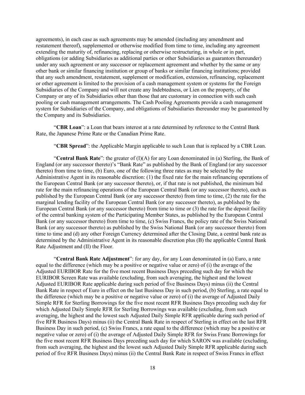 18 agreements), in each case as such agreements may be amended (including any amendment and restatement thereof), supplemented or otherwise modified from time to time, including any agreement extending the maturity of, refinancing, replacing or otherwise restructuring, in whole or in part, obligations (or adding Subsidiaries as additional parties or other Subsidiaries as guarantors thereunder) under any such agreement or any successor or replacement agreement and whether by the same or any other bank or similar financing institution or group of banks or similar financing institutions; provided that any such amendment, restatement, supplement or modification, extension, refinancing, replacement or other agreement is limited to the provision of a cash management system or systems for the Foreign Subsidiaries of the Company and will not create any Indebtedness, or Lien on the property, of the Company or any of its Subsidiaries other than those that are customary in connection with such cash pooling or cash management arrangements. The Cash Pooling Agreements provide a cash management system for Subsidiaries of the Company, and obligations of Subsidiaries thereunder may be guaranteed by the Company and its Subsidiaries. “CBR Loan”: a Loan that bears interest at a rate determined by reference to the Central Bank Rate, the Japanese Prime Rate or the Canadian Prime Rate. “CBR Spread”: the Applicable Margin applicable to such Loan that is replaced by a CBR Loan. “Central Bank Rate”: the greater of (I)(A) for any Loan denominated in (a) Sterling, the Bank of England (or any successor thereto)’s “Bank Rate” as published by the Bank of England (or any successor thereto) from time to time, (b) Euro, one of the following three rates as may be selected by the Administrative Agent in its reasonable discretion: (1) the fixed rate for the main refinancing operations of the European Central Bank (or any successor thereto), or, if that rate is not published, the minimum bid rate for the main refinancing operations of the European Central Bank (or any successor thereto), each as published by the European Central Bank (or any successor thereto) from time to time, (2) the rate for the marginal lending facility of the European Central Bank (or any successor thereto), as published by the European Central Bank (or any successor thereto) from time to time or (3) the rate for the deposit facility of the central banking system of the Participating Member States, as published by the European Central Bank (or any successor thereto) from time to time, (c) Swiss Francs, the policy rate of the Swiss National Bank (or any successor thereto) as published by the Swiss National Bank (or any successor thereto) from time to time and (d) any other Foreign Currency determined after the Closing Date, a central bank rate as determined by the Administrative Agent in its reasonable discretion plus (B) the applicable Central Bank Rate Adjustment and (II) the Floor. “Central Bank Rate Adjustment”: for any day, for any Loan denominated in (a) Euro, a rate equal to the difference (which may be a positive or negative value or zero) of (i) the average of the Adjusted EURIBOR Rate for the five most recent Business Days preceding such day for which the EURIBOR Screen Rate was available (excluding, from such averaging, the highest and the lowest Adjusted EURIBOR Rate applicable during such period of five Business Days) minus (ii) the Central Bank Rate in respect of Euro in effect on the last Business Day in such period, (b) Sterling, a rate equal to the difference (which may be a positive or negative value or zero) of (i) the average of Adjusted Daily Simple RFR for Sterling Borrowings for the five most recent RFR Business Days preceding such day for which Adjusted Daily Simple RFR for Sterling Borrowings was available (excluding, from such averaging, the highest and the lowest such Adjusted Daily Simple RFR applicable during such period of five RFR Business Days) minus (ii) the Central Bank Rate in respect of Sterling in effect on the last RFR Business Day in such period, (c) Swiss Francs, a rate equal to the difference (which may be a positive or negative value or zero) of (i) the average of Adjusted Daily Simple RFR for Swiss Franc Borrowings for the five most recent RFR Business Days preceding such day for which SARON was available (excluding, from such averaging, the highest and the lowest such Adjusted Daily Simple RFR applicable during such period of five RFR Business Days) minus (ii) the Central Bank Rate in respect of Swiss Francs in effect