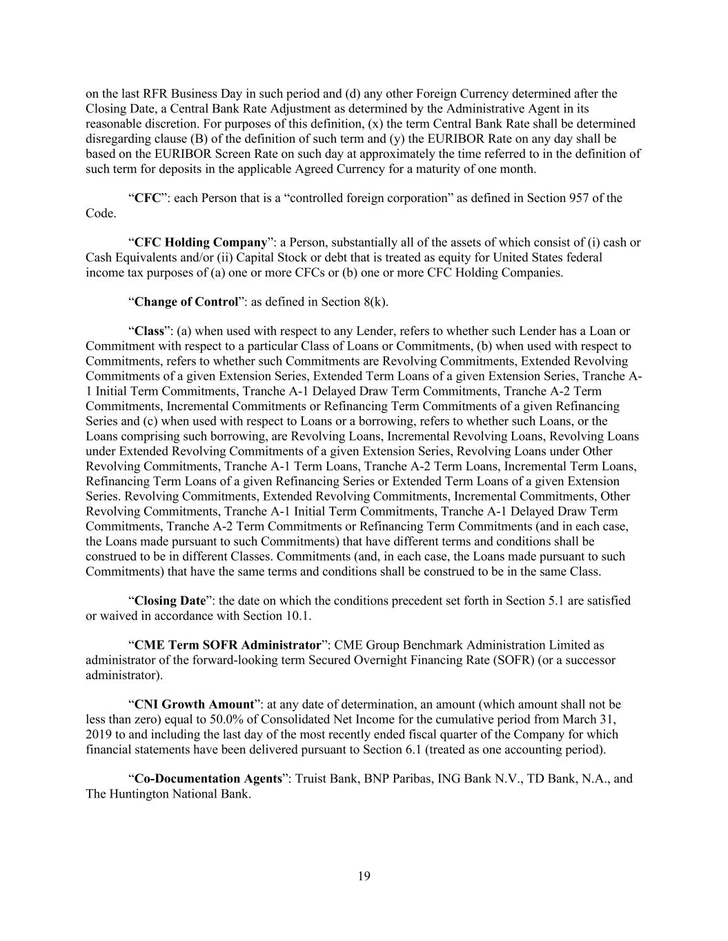 19 on the last RFR Business Day in such period and (d) any other Foreign Currency determined after the Closing Date, a Central Bank Rate Adjustment as determined by the Administrative Agent in its reasonable discretion. For purposes of this definition, (x) the term Central Bank Rate shall be determined disregarding clause (B) of the definition of such term and (y) the EURIBOR Rate on any day shall be based on the EURIBOR Screen Rate on such day at approximately the time referred to in the definition of such term for deposits in the applicable Agreed Currency for a maturity of one month. “CFC”: each Person that is a “controlled foreign corporation” as defined in Section 957 of the Code. “CFC Holding Company”: a Person, substantially all of the assets of which consist of (i) cash or Cash Equivalents and/or (ii) Capital Stock or debt that is treated as equity for United States federal income tax purposes of (a) one or more CFCs or (b) one or more CFC Holding Companies. “Change of Control”: as defined in Section 8(k). “Class”: (a) when used with respect to any Lender, refers to whether such Lender has a Loan or Commitment with respect to a particular Class of Loans or Commitments, (b) when used with respect to Commitments, refers to whether such Commitments are Revolving Commitments, Extended Revolving Commitments of a given Extension Series, Extended Term Loans of a given Extension Series, Tranche A- 1 Initial Term Commitments, Tranche A-1 Delayed Draw Term Commitments, Tranche A-2 Term Commitments, Incremental Commitments or Refinancing Term Commitments of a given Refinancing Series and (c) when used with respect to Loans or a borrowing, refers to whether such Loans, or the Loans comprising such borrowing, are Revolving Loans, Incremental Revolving Loans, Revolving Loans under Extended Revolving Commitments of a given Extension Series, Revolving Loans under Other Revolving Commitments, Tranche A-1 Term Loans, Tranche A-2 Term Loans, Incremental Term Loans, Refinancing Term Loans of a given Refinancing Series or Extended Term Loans of a given Extension Series. Revolving Commitments, Extended Revolving Commitments, Incremental Commitments, Other Revolving Commitments, Tranche A-1 Initial Term Commitments, Tranche A-1 Delayed Draw Term Commitments, Tranche A-2 Term Commitments or Refinancing Term Commitments (and in each case, the Loans made pursuant to such Commitments) that have different terms and conditions shall be construed to be in different Classes. Commitments (and, in each case, the Loans made pursuant to such Commitments) that have the same terms and conditions shall be construed to be in the same Class. “Closing Date”: the date on which the conditions precedent set forth in Section 5.1 are satisfied or waived in accordance with Section 10.1. “CME Term SOFR Administrator”: CME Group Benchmark Administration Limited as administrator of the forward-looking term Secured Overnight Financing Rate (SOFR) (or a successor administrator). “CNI Growth Amount”: at any date of determination, an amount (which amount shall not be less than zero) equal to 50.0% of Consolidated Net Income for the cumulative period from March 31, 2019 to and including the last day of the most recently ended fiscal quarter of the Company for which financial statements have been delivered pursuant to Section 6.1 (treated as one accounting period). “Co-Documentation Agents”: Truist Bank, BNP Paribas, ING Bank N.V., TD Bank, N.A., and The Huntington National Bank.