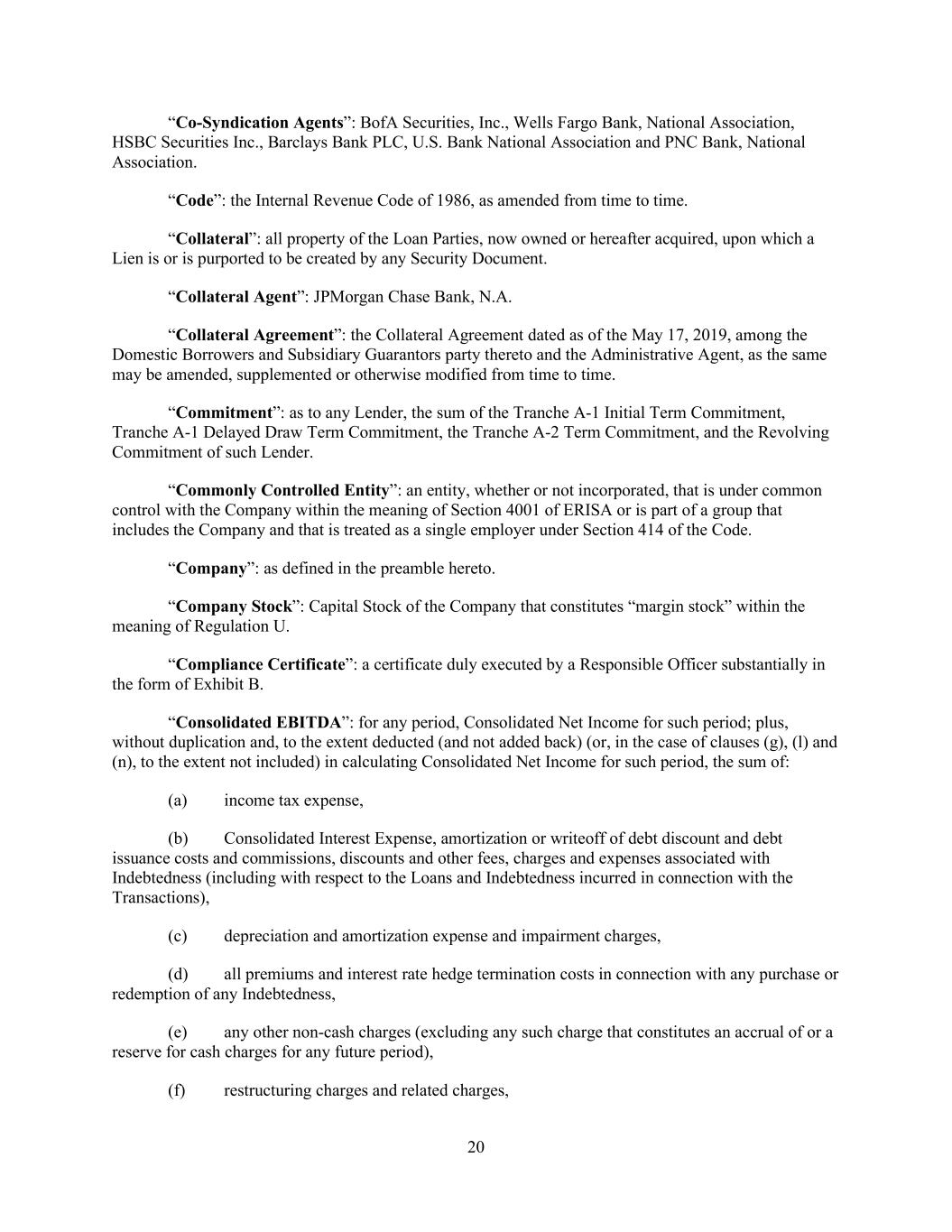 20 “Co-Syndication Agents”: BofA Securities, Inc., Wells Fargo Bank, National Association, HSBC Securities Inc., Barclays Bank PLC, U.S. Bank National Association and PNC Bank, National Association. “Code”: the Internal Revenue Code of 1986, as amended from time to time. “Collateral”: all property of the Loan Parties, now owned or hereafter acquired, upon which a Lien is or is purported to be created by any Security Document. “Collateral Agent”: JPMorgan Chase Bank, N.A. “Collateral Agreement”: the Collateral Agreement dated as of the May 17, 2019, among the Domestic Borrowers and Subsidiary Guarantors party thereto and the Administrative Agent, as the same may be amended, supplemented or otherwise modified from time to time. “Commitment”: as to any Lender, the sum of the Tranche A-1 Initial Term Commitment, Tranche A-1 Delayed Draw Term Commitment, the Tranche A-2 Term Commitment, and the Revolving Commitment of such Lender. “Commonly Controlled Entity”: an entity, whether or not incorporated, that is under common control with the Company within the meaning of Section 4001 of ERISA or is part of a group that includes the Company and that is treated as a single employer under Section 414 of the Code. “Company”: as defined in the preamble hereto. “Company Stock”: Capital Stock of the Company that constitutes “margin stock” within the meaning of Regulation U. “Compliance Certificate”: a certificate duly executed by a Responsible Officer substantially in the form of Exhibit B. “Consolidated EBITDA”: for any period, Consolidated Net Income for such period; plus, without duplication and, to the extent deducted (and not added back) (or, in the case of clauses (g), (l) and (n), to the extent not included) in calculating Consolidated Net Income for such period, the sum of: (a) income tax expense, (b) Consolidated Interest Expense, amortization or writeoff of debt discount and debt issuance costs and commissions, discounts and other fees, charges and expenses associated with Indebtedness (including with respect to the Loans and Indebtedness incurred in connection with the Transactions), (c) depreciation and amortization expense and impairment charges, (d) all premiums and interest rate hedge termination costs in connection with any purchase or redemption of any Indebtedness, (e) any other non-cash charges (excluding any such charge that constitutes an accrual of or a reserve for cash charges for any future period), (f) restructuring charges and related charges,