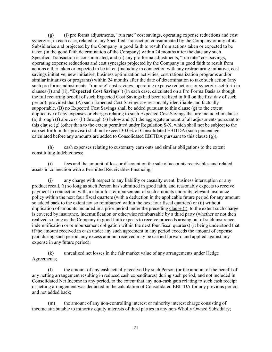 21 (g) (i) pro forma adjustments, “run rate” cost savings, operating expense reductions and cost synergies, in each case, related to any Specified Transaction consummated by the Company or any of its Subsidiaries and projected by the Company in good faith to result from actions taken or expected to be taken (in the good faith determination of the Company) within 24 months after the date any such Specified Transaction is consummated, and (ii) any pro forma adjustments, “run rate” cost savings, operating expense reductions and cost synergies projected by the Company in good faith to result from actions either taken or expected to be taken (including in connection with any restructuring initiative, cost savings initiative, new initiative, business optimization activities, cost rationalization programs and/or similar initiatives or programs) within 24 months after the date of determination to take such action (any such pro forma adjustments, “run rate” cost savings, operating expense reductions or synergies set forth in clauses (i) and (ii), “Expected Cost Savings”) (in each case, calculated on a Pro Forma Basis as though the full recurring benefit of such Expected Cost Savings had been realized in full on the first day of such period); provided that (A) such Expected Cost Savings are reasonably identifiable and factually supportable, (B) no Expected Cost Savings shall be added pursuant to this clause (g) to the extent duplicative of any expenses or charges relating to such Expected Cost Savings that are included in clause (a) through (f) above or (h) through (s) below and (C) the aggregate amount of all adjustments pursuant to this clause (g) (other than to the extent permitted under Regulation S-X, which shall not be subject to the cap set forth in this proviso) shall not exceed 30.0% of Consolidated EBITDA (such percentage calculated before any amounts are added to Consolidated EBITDA pursuant to this clause (g)), (h) cash expenses relating to customary earn outs and similar obligations to the extent constituting Indebtedness; (i) fees and the amount of loss or discount on the sale of accounts receivables and related assets in connection with a Permitted Receivables Financing; (j) any charge with respect to any liability or casualty event, business interruption or any product recall, (i) so long as such Person has submitted in good faith, and reasonably expects to receive payment in connection with, a claim for reimbursement of such amounts under its relevant insurance policy within the next four fiscal quarters (with a deduction in the applicable future period for any amount so added back to the extent not so reimbursed within the next four fiscal quarters) or (ii) without duplication of amounts included in a prior period under the preceding clause (i), to the extent such charge is covered by insurance, indemnification or otherwise reimbursable by a third party (whether or not then realized so long as the Company in good faith expects to receive proceeds arising out of such insurance, indemnification or reimbursement obligation within the next four fiscal quarters) (it being understood that if the amount received in cash under any such agreement in any period exceeds the amount of expense paid during such period, any excess amount received may be carried forward and applied against any expense in any future period); (k) unrealized net losses in the fair market value of any arrangements under Hedge Agreements; (l) the amount of any cash actually received by such Person (or the amount of the benefit of any netting arrangement resulting in reduced cash expenditures) during such period, and not included in Consolidated Net Income in any period, to the extent that any non-cash gain relating to such cash receipt or netting arrangement was deducted in the calculation of Consolidated EBITDA for any previous period and not added back; (m) the amount of any non-controlling interest or minority interest charge consisting of income attributable to minority equity interests of third parties in any non-Wholly Owned Subsidiary;