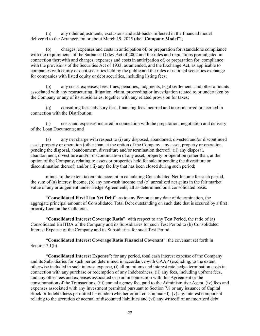 22 (n) any other adjustments, exclusions and add-backs reflected in the financial model delivered to the Arrangers on or about March 19, 2025 (the “Company Model”); (o) charges, expenses and costs in anticipation of, or preparation for, standalone compliance with the requirements of the Sarbanes-Oxley Act of 2002 and the rules and regulations promulgated in connection therewith and charges, expenses and costs in anticipation of, or preparation for, compliance with the provisions of the Securities Act of 1933, as amended, and the Exchange Act, as applicable to companies with equity or debt securities held by the public and the rules of national securities exchange for companies with listed equity or debt securities, including listing fees; (p) any costs, expenses, fees, fines, penalties, judgments, legal settlements and other amounts associated with any restructuring, litigation, claim, proceeding or investigation related to or undertaken by the Company or any of its subsidiaries, together with any related provision for taxes; (q) consulting fees, advisory fees, financing fees incurred and taxes incurred or accrued in connection with the Distribution; (r) costs and expenses incurred in connection with the preparation, negotiation and delivery of the Loan Documents; and (s) any net charge with respect to (i) any disposed, abandoned, divested and/or discontinued asset, property or operation (other than, at the option of the Company, any asset, property or operation pending the disposal, abandonment, divestiture and/or termination thereof), (ii) any disposal, abandonment, divestiture and/or discontinuation of any asset, property or operation (other than, at the option of the Company, relating to assets or properties held for sale or pending the divestiture or discontinuation thereof) and/or (iii) any facility that has been closed during such period; minus, to the extent taken into account in calculating Consolidated Net Income for such period, the sum of (a) interest income, (b) any non-cash income and (c) unrealized net gains in the fair market value of any arrangement under Hedge Agreements, all as determined on a consolidated basis. “Consolidated First Lien Net Debt”: as to any Person at any date of determination, the aggregate principal amount of Consolidated Total Debt outstanding on such date that is secured by a first priority Lien on the Collateral. “Consolidated Interest Coverage Ratio”: with respect to any Test Period, the ratio of (a) Consolidated EBITDA of the Company and its Subsidiaries for such Test Period to (b) Consolidated Interest Expense of the Company and its Subsidiaries for such Test Period. “Consolidated Interest Coverage Ratio Financial Covenant”: the covenant set forth in Section 7.1(b). “Consolidated Interest Expense”: for any period, total cash interest expense of the Company and its Subsidiaries for such period determined in accordance with GAAP (excluding, to the extent otherwise included in such interest expense, (i) all premiums and interest rate hedge termination costs in connection with any purchase or redemption of any Indebtedness, (ii) any fees, including upfront fees, and any other fees and expenses associated or paid in connection with this Agreement or the consummation of the Transactions, (iii) annual agency fee, paid to the Administrative Agent, (iv) fees and expenses associated with any Investment permitted pursuant to Section 7.8 or any issuance of Capital Stock or Indebtedness permitted hereunder (whether or not consummated), (v) any interest component relating to the accretion or accrual of discounted liabilities and (vi) any writeoff of unamortized debt