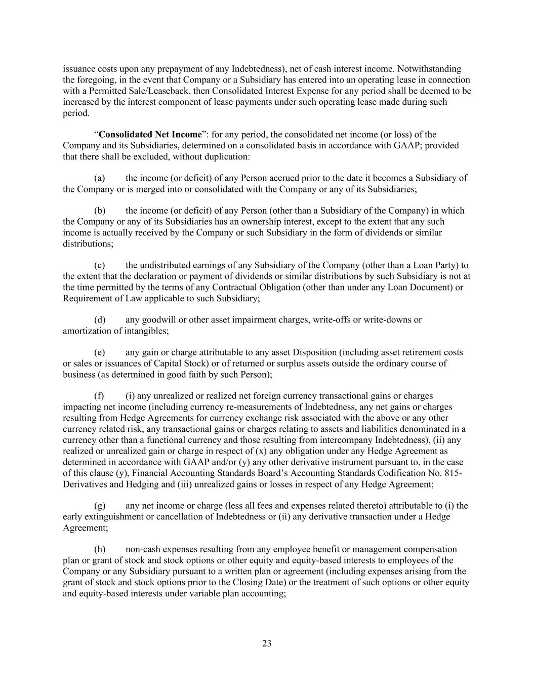 23 issuance costs upon any prepayment of any Indebtedness), net of cash interest income. Notwithstanding the foregoing, in the event that Company or a Subsidiary has entered into an operating lease in connection with a Permitted Sale/Leaseback, then Consolidated Interest Expense for any period shall be deemed to be increased by the interest component of lease payments under such operating lease made during such period. “Consolidated Net Income”: for any period, the consolidated net income (or loss) of the Company and its Subsidiaries, determined on a consolidated basis in accordance with GAAP; provided that there shall be excluded, without duplication: (a) the income (or deficit) of any Person accrued prior to the date it becomes a Subsidiary of the Company or is merged into or consolidated with the Company or any of its Subsidiaries; (b) the income (or deficit) of any Person (other than a Subsidiary of the Company) in which the Company or any of its Subsidiaries has an ownership interest, except to the extent that any such income is actually received by the Company or such Subsidiary in the form of dividends or similar distributions; (c) the undistributed earnings of any Subsidiary of the Company (other than a Loan Party) to the extent that the declaration or payment of dividends or similar distributions by such Subsidiary is not at the time permitted by the terms of any Contractual Obligation (other than under any Loan Document) or Requirement of Law applicable to such Subsidiary; (d) any goodwill or other asset impairment charges, write-offs or write-downs or amortization of intangibles; (e) any gain or charge attributable to any asset Disposition (including asset retirement costs or sales or issuances of Capital Stock) or of returned or surplus assets outside the ordinary course of business (as determined in good faith by such Person); (f) (i) any unrealized or realized net foreign currency transactional gains or charges impacting net income (including currency re-measurements of Indebtedness, any net gains or charges resulting from Hedge Agreements for currency exchange risk associated with the above or any other currency related risk, any transactional gains or charges relating to assets and liabilities denominated in a currency other than a functional currency and those resulting from intercompany Indebtedness), (ii) any realized or unrealized gain or charge in respect of (x) any obligation under any Hedge Agreement as determined in accordance with GAAP and/or (y) any other derivative instrument pursuant to, in the case of this clause (y), Financial Accounting Standards Board’s Accounting Standards Codification No. 815- Derivatives and Hedging and (iii) unrealized gains or losses in respect of any Hedge Agreement; (g) any net income or charge (less all fees and expenses related thereto) attributable to (i) the early extinguishment or cancellation of Indebtedness or (ii) any derivative transaction under a Hedge Agreement; (h) non-cash expenses resulting from any employee benefit or management compensation plan or grant of stock and stock options or other equity and equity-based interests to employees of the Company or any Subsidiary pursuant to a written plan or agreement (including expenses arising from the grant of stock and stock options prior to the Closing Date) or the treatment of such options or other equity and equity-based interests under variable plan accounting;